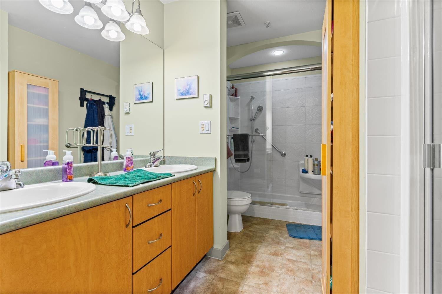 This rare Double Master condo offers both comfort and convenience in a prime central location. With quick access to the hi way, commuting is a breeze wile you enjoy being close to shops, dining, and amenities. The home features two spacious master bedrooms, each with its own ensuite, plus thoughtful upgrades including a brand new microwave and dishwasher. Enjoy peace of mind with the most secure underground parking in Abbotsford, a garage within the underground. It makes this condo ideal for professionals, couples, or anyone seeking a safe and stylish home base. Don't miss this unique opportunity, Schedule your showing today! (id:63510)