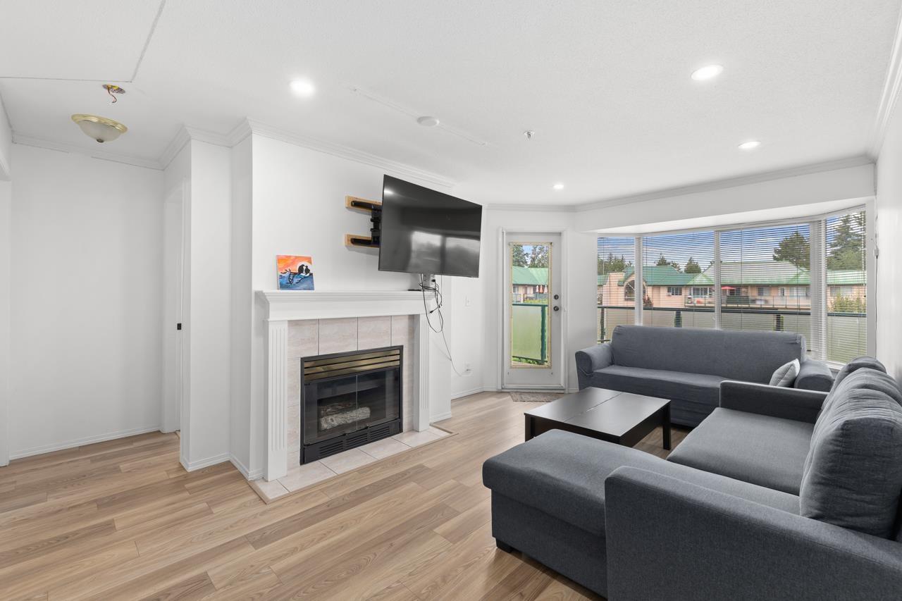 Top-floor unit - affordable and perfect for first-time buyers or those looking to downsize! Situated in a welcoming, family-friendly neighborhood, this spacious and well-maintained home offers 2 bedrooms and 2 full bathrooms. The bright living room features a cozy gas fireplace (gas and hot water are included in the strata fees) complemented by tasteful updates throughout, including new tiles, laminate flooring, fresh paint, new carpet in both bedrooms, and pot lights in the living room. Comes with 1 underground parking stall and is within walking distance to W.J. Mouat High, Howe Middle, John Maclure Elementary, shopping, Rotary Stadium, Seven Oaks, Mill Lake, and Matsqui Rec Center. Contact for more details! (id:63510)