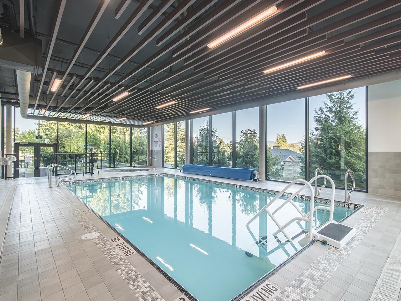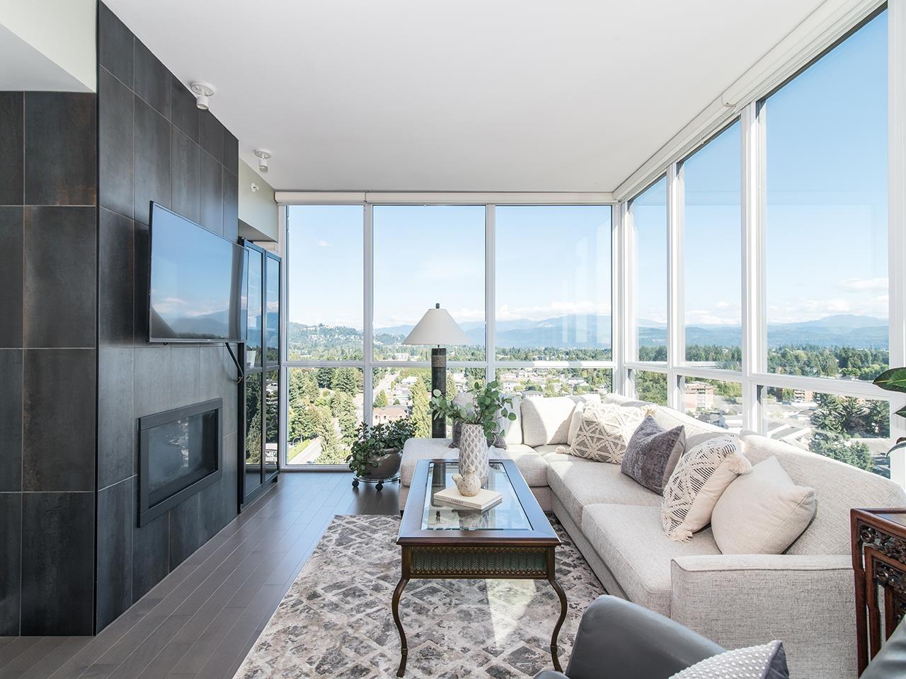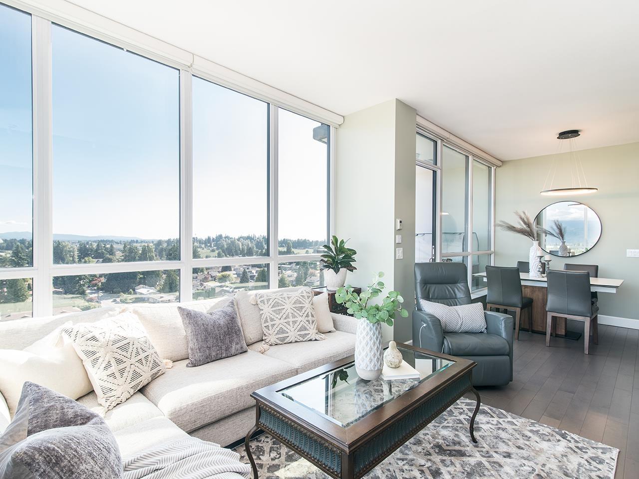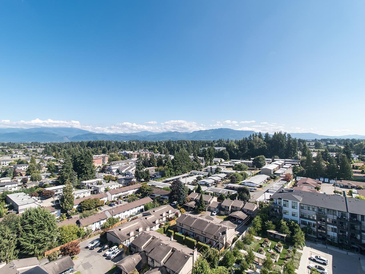 Spectacular 2 bedroom 2 bath view corner unit condo on the 15th floor of Abbotsford's ONLY luxury concrete high-rise. The Mahogany at Mill Lake, built in 2018 offers geothermal heating/cooling + an amenities package 2nd to none including indoor pool, fitness center, hot tub, workshop, bistro, guest suites, outdoor barbecue patio & club room. This condo has stunning open concept design with elegant finishes including newly installed hardwood flooring, new blinds, gas fireplace, high end appliances and beautiful quartz countertops. This home is bathed in natural sunlight, offers beautiful views both south & east in a perfect location steps to beautiful Mill Lake Park, trendy shops & restaurants, hospital etc. 2 parking stalls, storage locker and private deck to enjoy those morning sunrises! (id:63510)