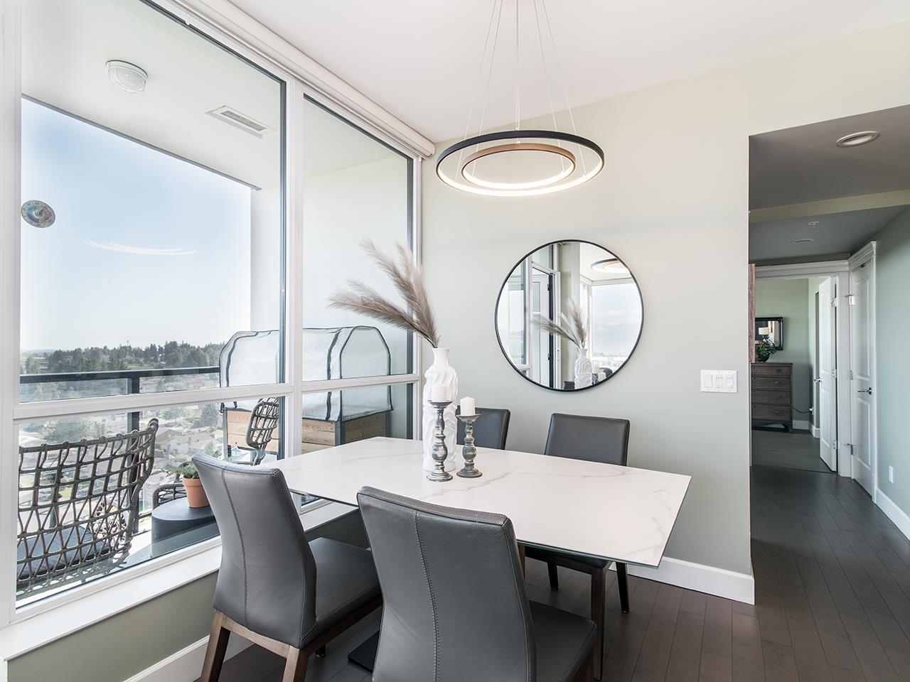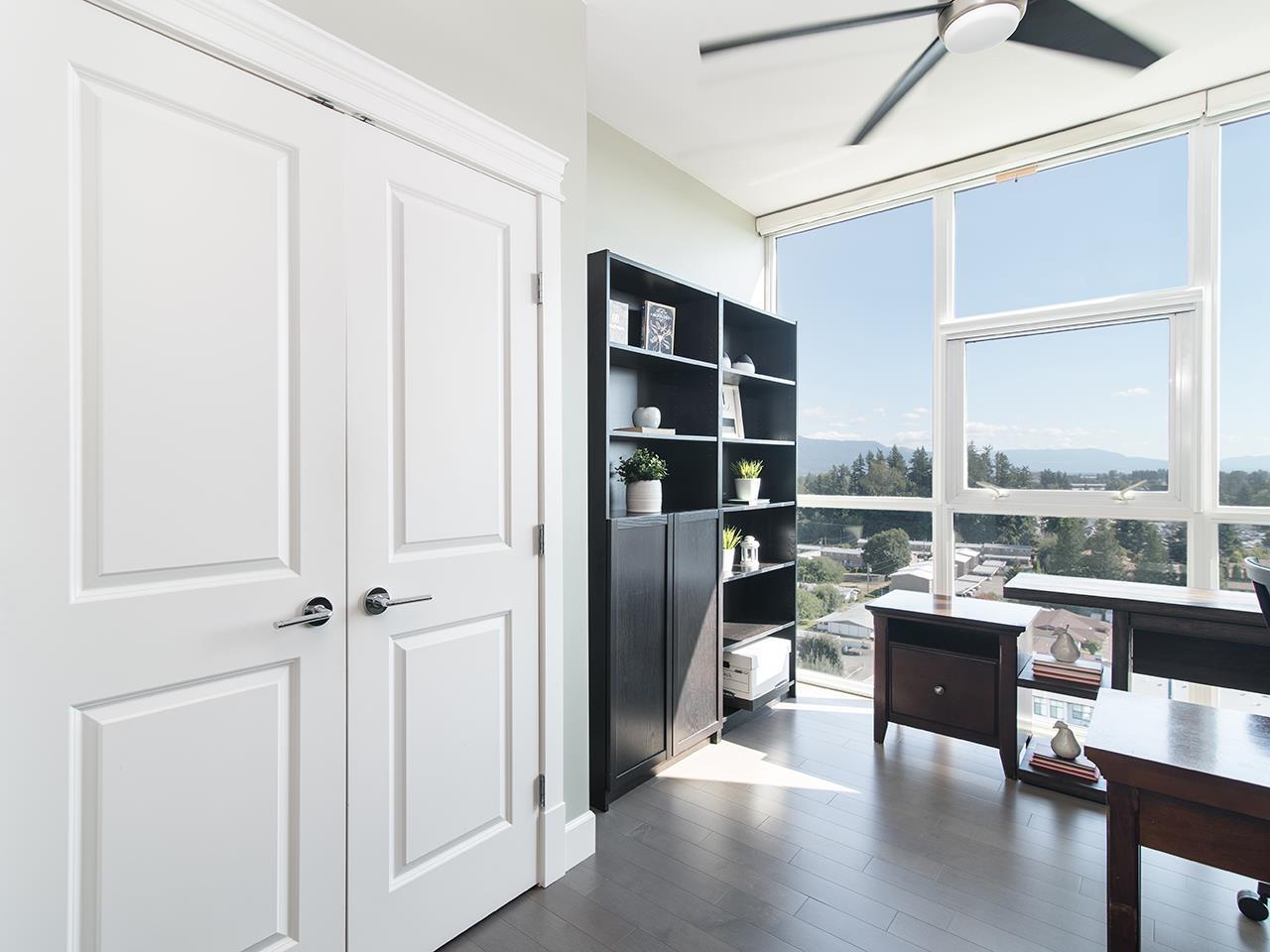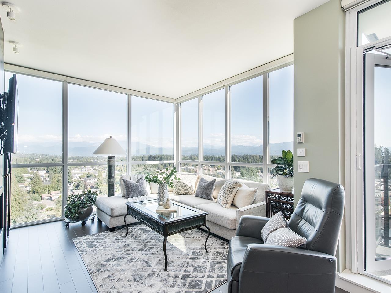 Spectacular 2 bedroom 2 bath view corner unit condo on the 15th floor of Abbotsford's ONLY luxury concrete high-rise. The Mahogany at Mill Lake, built in 2018 offers geothermal heating/cooling + an amenities package 2nd to none including indoor pool, fitness center, hot tub, workshop, bistro, guest suites, outdoor barbecue patio & club room. This condo has stunning open concept design with elegant finishes including newly installed hardwood flooring, new blinds, gas fireplace, high end appliances and beautiful quartz countertops. This home is bathed in natural sunlight, offers beautiful views both south & east in a perfect location steps to beautiful Mill Lake Park, trendy shops & restaurants, hospital etc. 2 parking stalls, storage locker and private deck to enjoy those morning sunrises! (id:63510)