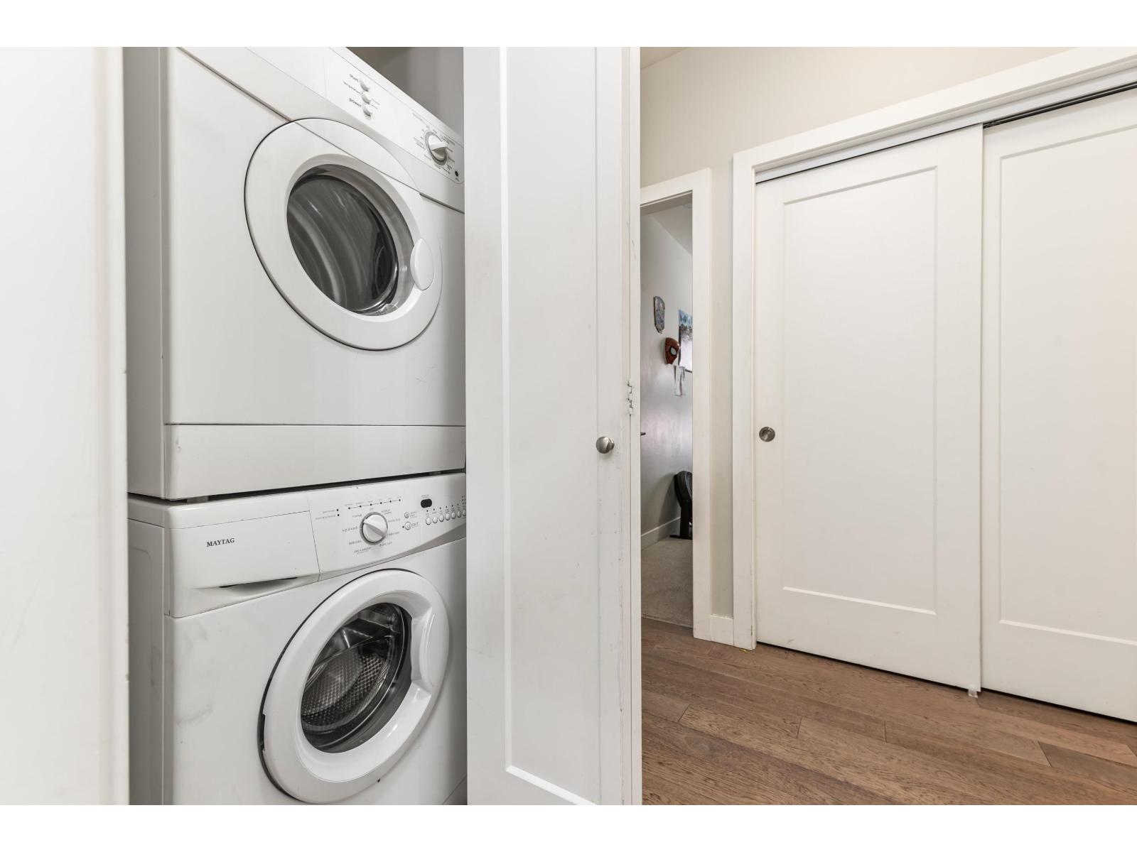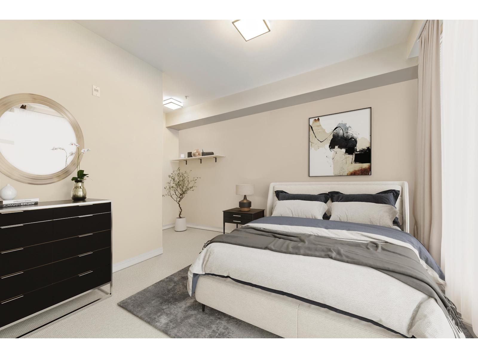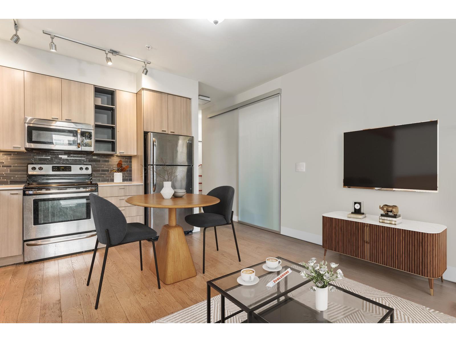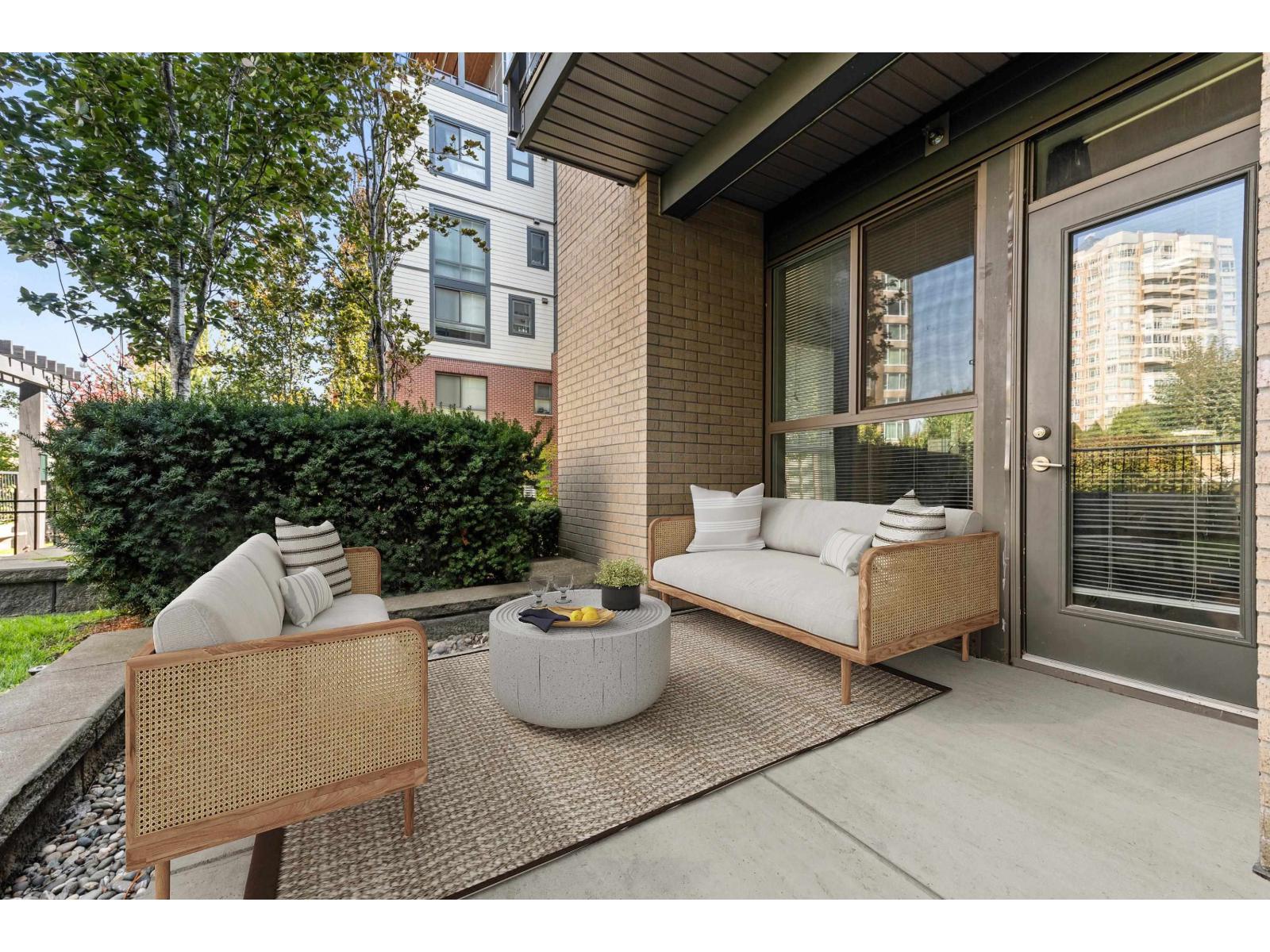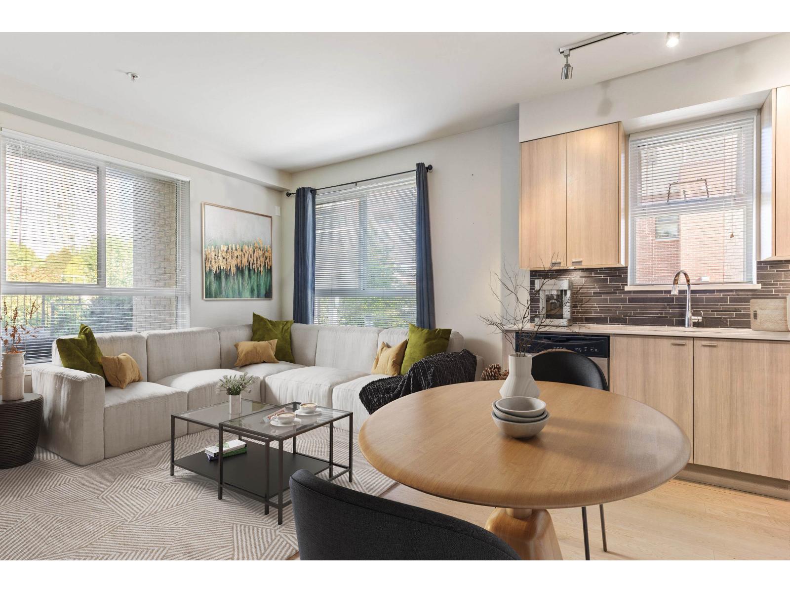 Welcome to the sought-after Hudson's Loft in the heart of Central Abbotsford, where convenience meets lifestyle. This 2bed/2bath +den unit presents an open-concept floor plan bathed in natural light. The well-appointed kitchen features SS appliances & ample cupboard space. The primary bedroom features a large ensuite with dual sinks, offering both functionality & elegance throughout. Step outside to discover an oversized patio, perfect for outdoor gatherings & relaxation. Additionally, this unit boasts a generous den, which can serve as an ideal office or playroom. Perfectly situated within Central Park Village, this residence provides easy access to community amenities, including restaurants, grocery stores, fitness centers, and more. 1 parking, storage & pet-friendly. New paint & carpet. (id:63510)