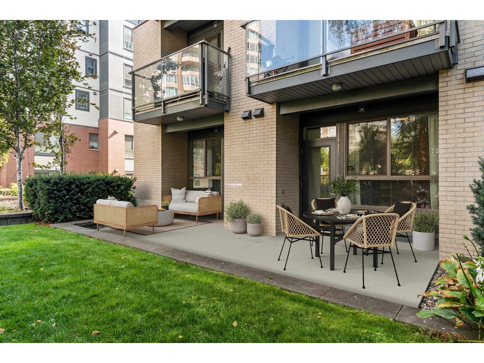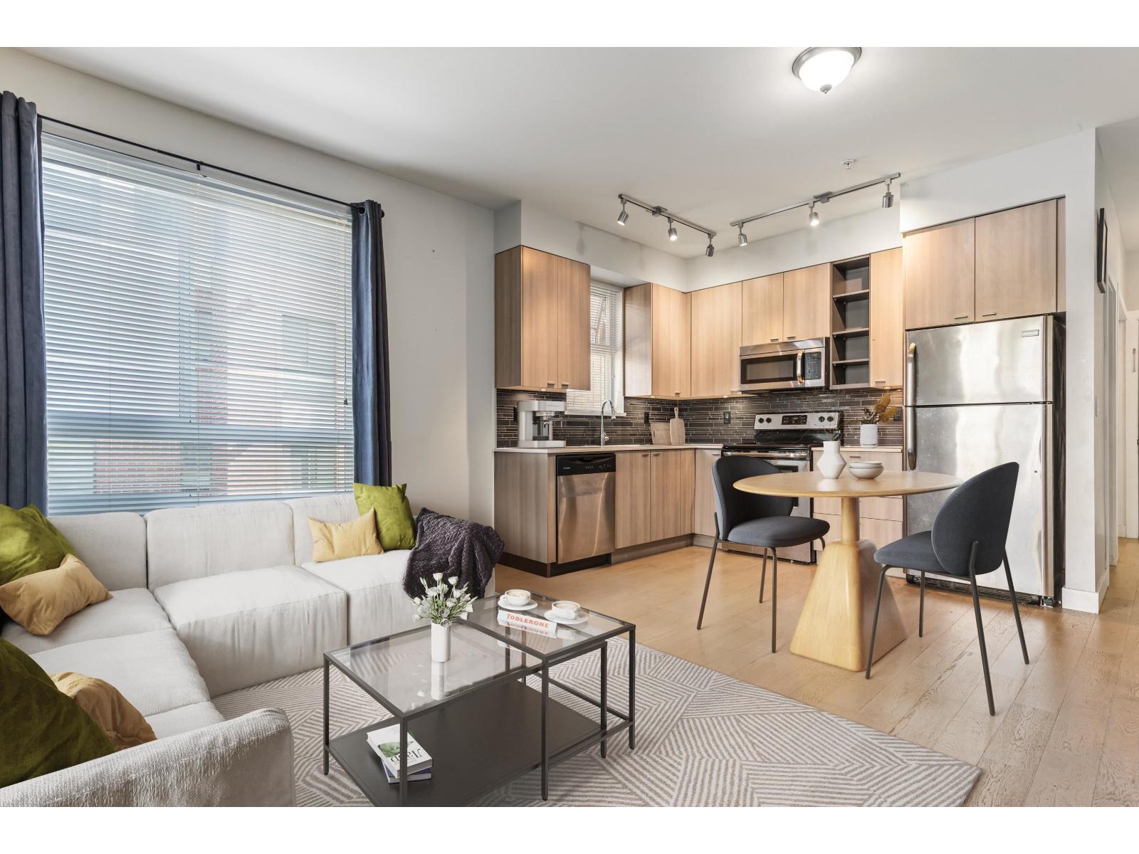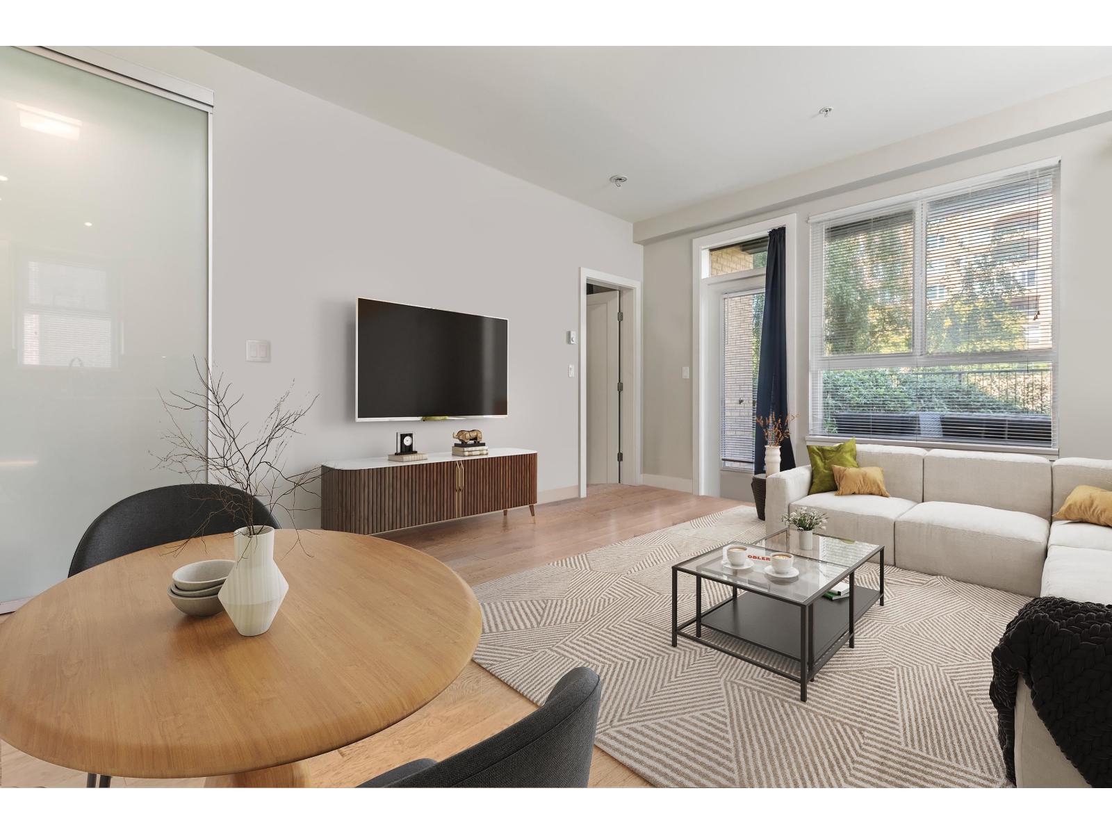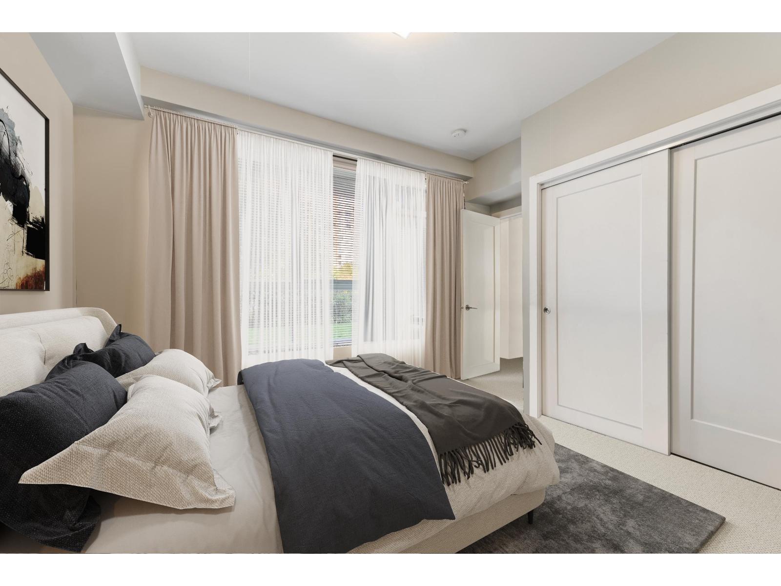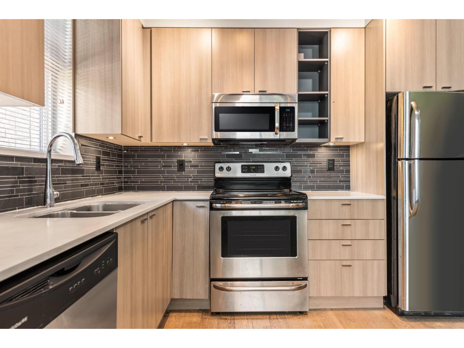 Welcome to the sought-after Hudson's Loft in the heart of Central Abbotsford, where convenience meets lifestyle. This 2bed/2bath +den unit presents an open-concept floor plan bathed in natural light. The well-appointed kitchen features SS appliances & ample cupboard space. The primary bedroom features a large ensuite with dual sinks, offering both functionality & elegance throughout. Step outside to discover an oversized patio, perfect for outdoor gatherings & relaxation. Additionally, this unit boasts a generous den, which can serve as an ideal office or playroom. Perfectly situated within Central Park Village, this residence provides easy access to community amenities, including restaurants, grocery stores, fitness centers, and more. 1 parking, storage & pet-friendly. New paint & carpet. (id:63510)