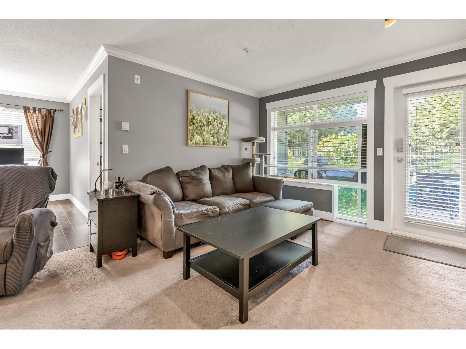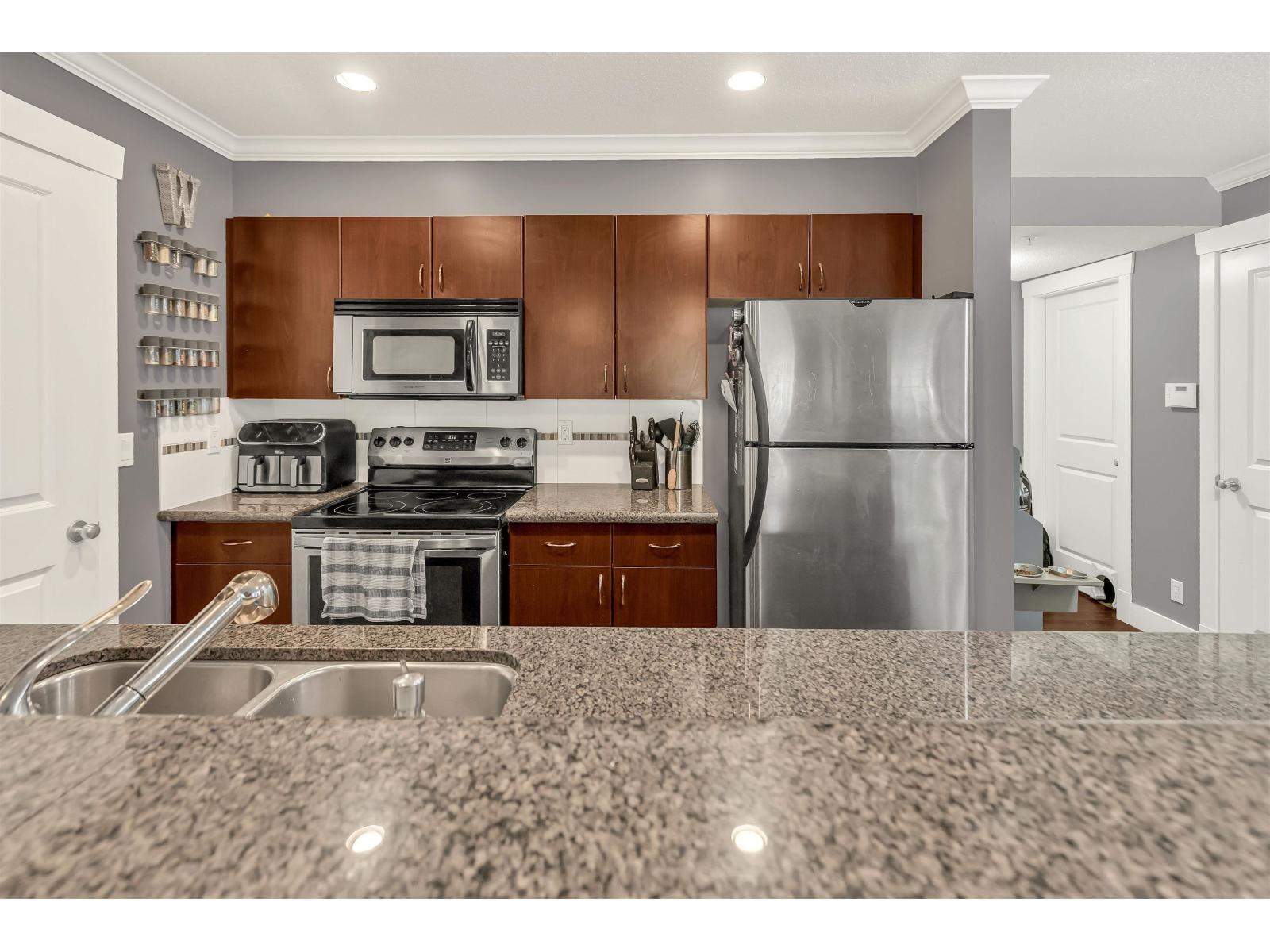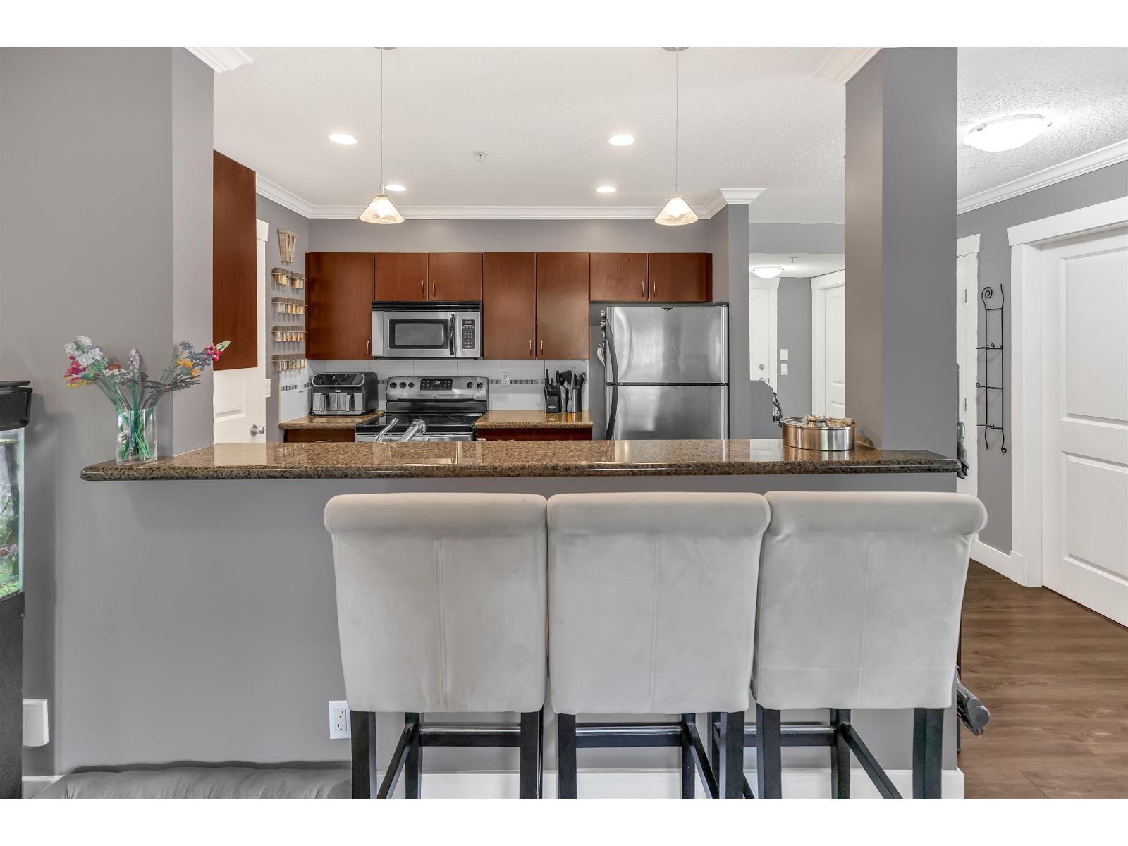 Welcome to The Brixton! This bright and spacious 2 bed, 2 bath end unit offers nearly 1100 sq ft of open living with large windows throughout and excellent privacy. The kitchen features granite countertops, stainless steel appliances, and a convenient breakfast bar that opens to the main living area-perfect for entertaining. Step out to your private 10x12 walk-out patio with direct access to a grassy area, ideal for pets, kids, or quiet mornings with coffee. Both bedrooms are generously sized, and the layout offers great separation and functionality. This unit also includes 2 underground parking stalls and a storage locker. Enjoy the comfort of a well-maintained building in a prime central Abbotsford location, close to shopping, parks, schools, and transit. A rare and desirable home! (id:63510)