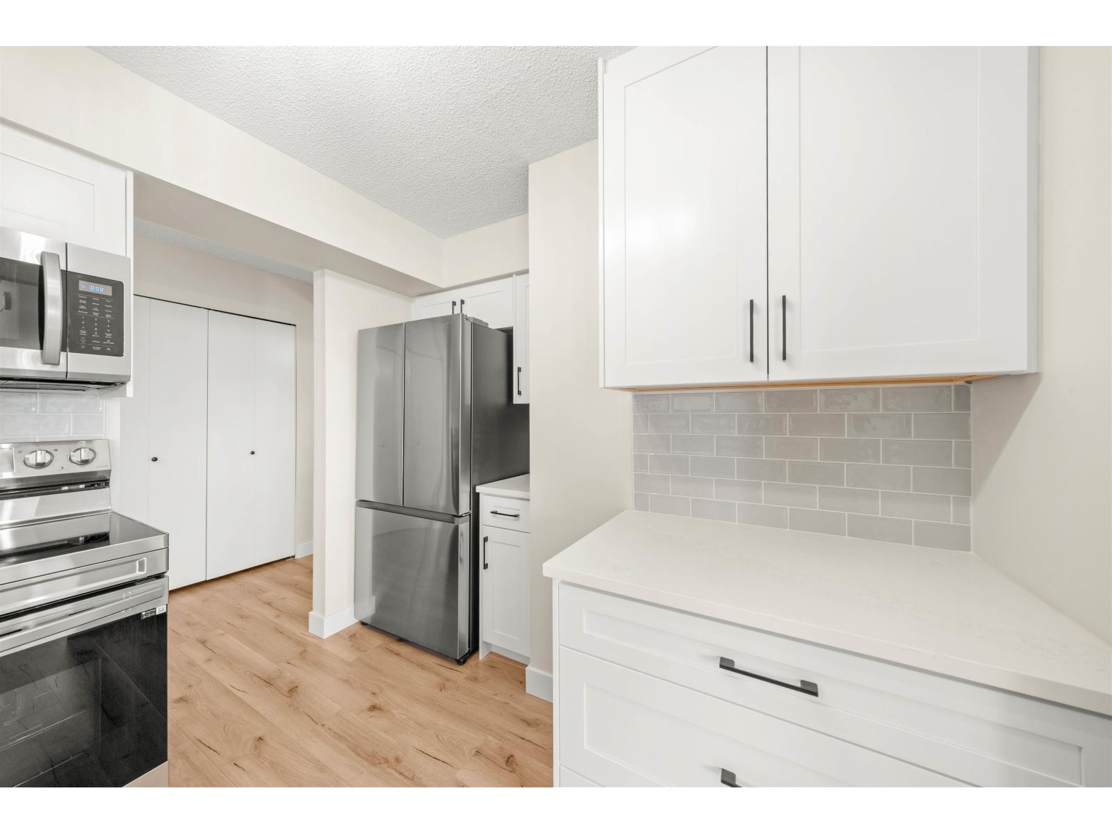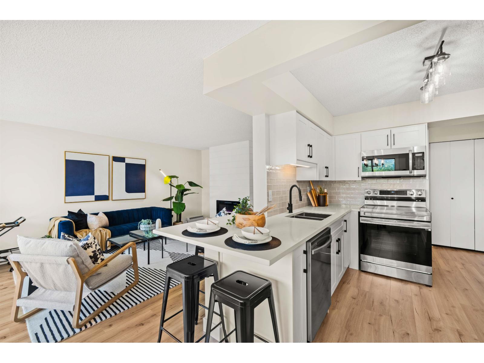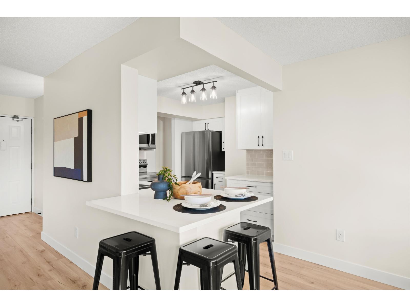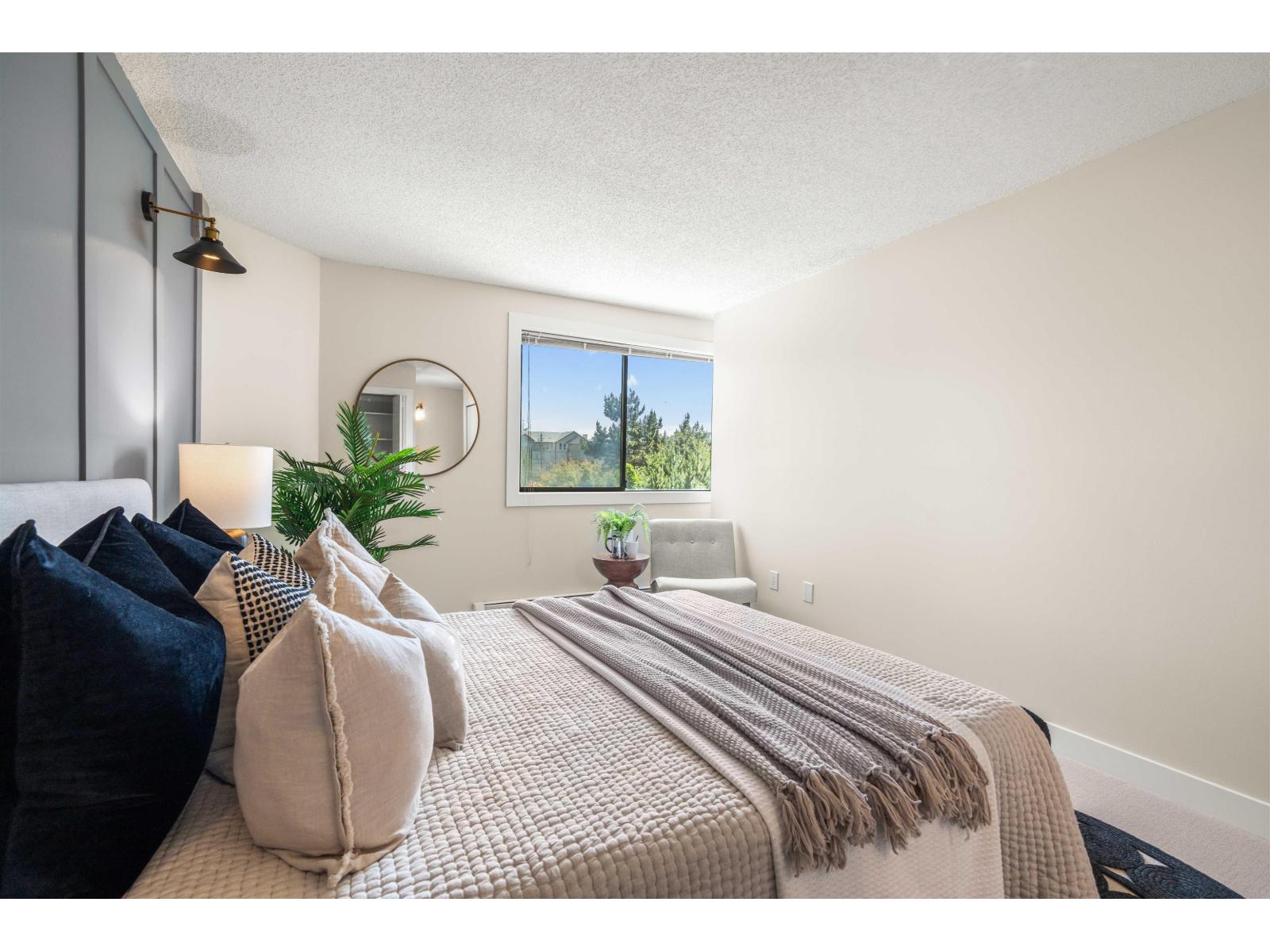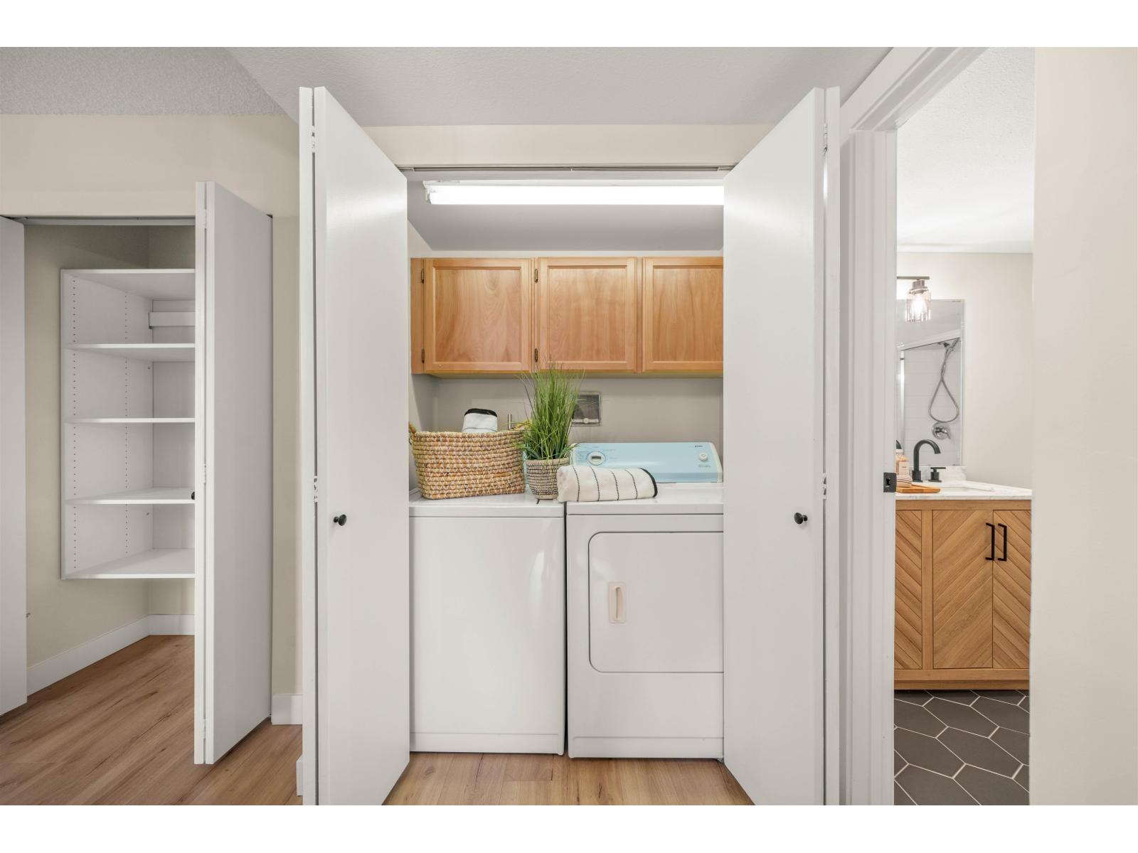 Renovation! Renovation! Renovation! This 2 bed, 2 bath unit is in Evergreen Village-one of Abbotsford's best managed 55+ communities. Concrete construction makes this home quiet and solid! Enjoy a spacious open-concept layout with a deluxe chef's kitchen, quartz counters, custom cabinetry, new stainless appliances, laminate flooring, A/C, and spa-like baths. Includes in-suite laundry and a versatile office/storage room. The building offers top-tier amenities: indoor pool, hot tub, workshop, library, hobby/recreation rooms, RV parking, guest suit and secured underground parking. Prime location with a bus stop out front and all essentials nearby. Call Today! (id:63510)