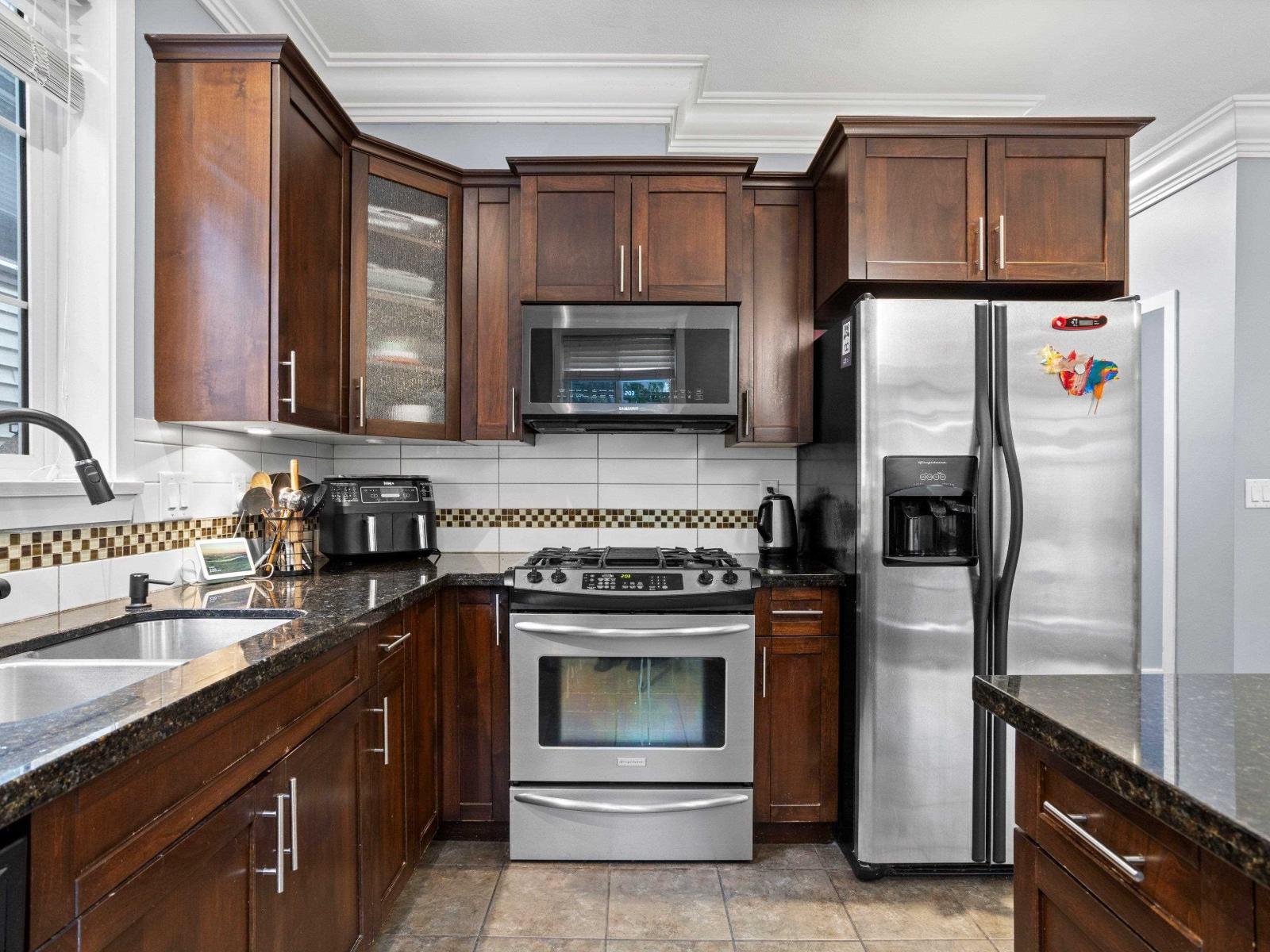 Experience comfortable, stylish living at this contemporary townhome in Ledgeview Villas, offering a spacious open-concept layout, modern finishes, stainless steel appliances, & a private balcony with serene views. The luxurious master suite, convenient in-suite laundry,& double garage with extra storage are just some of the highlights of this 4 bed,3 bath,2072 sq ft home. Natural light fills every room, enhancing the inviting atmosphere throughout. The beautifully maintained community grounds provide a welcoming environment ideal for families & entertaining guests. Enjoy the peaceful suburban surroundings near parks, trails, schools, & shopping, while still having easy city access. Don't miss out on owning this remarkable residence in one of Abbotsford's most sought-after neighborhoods. (id:63510)