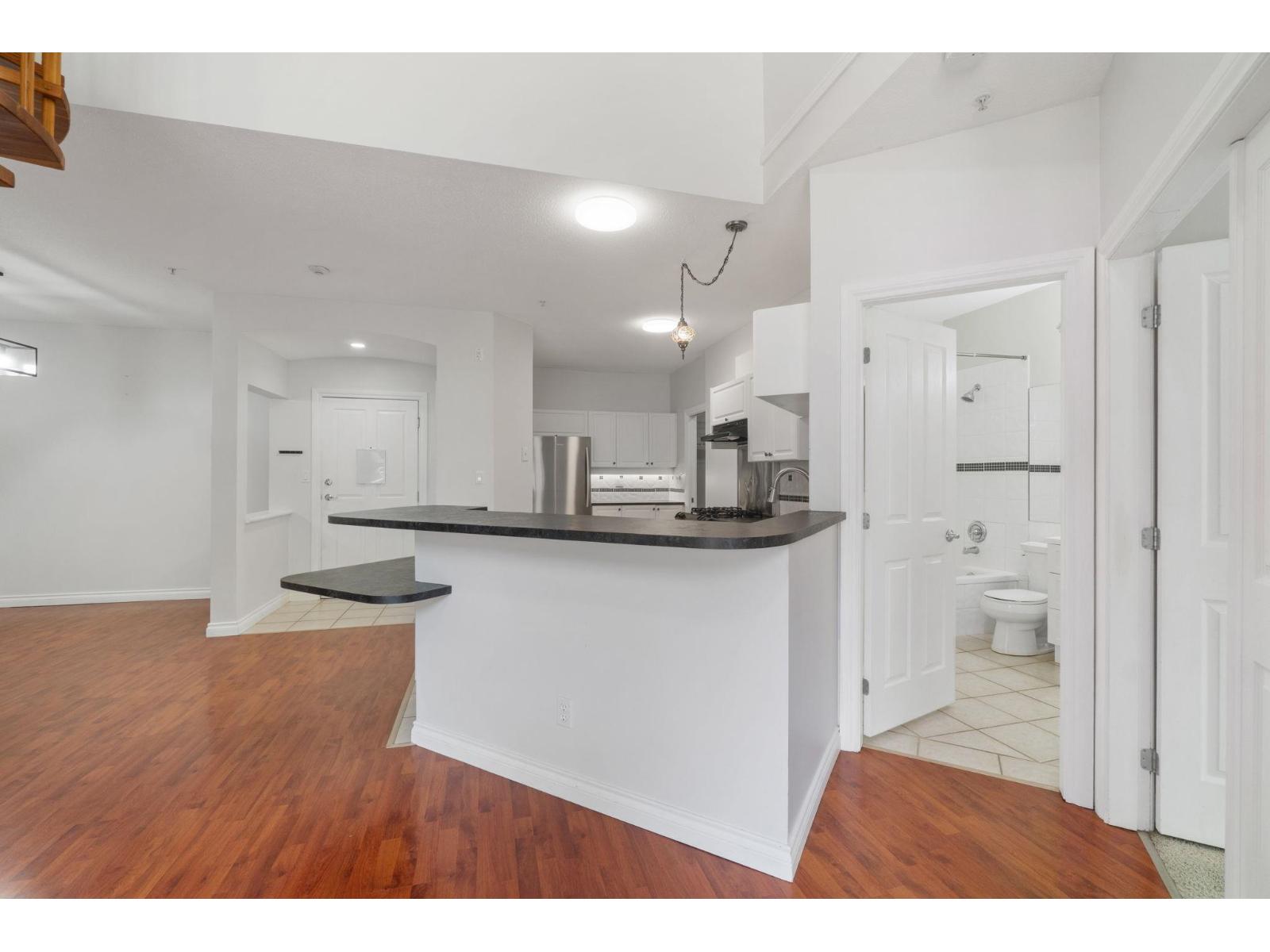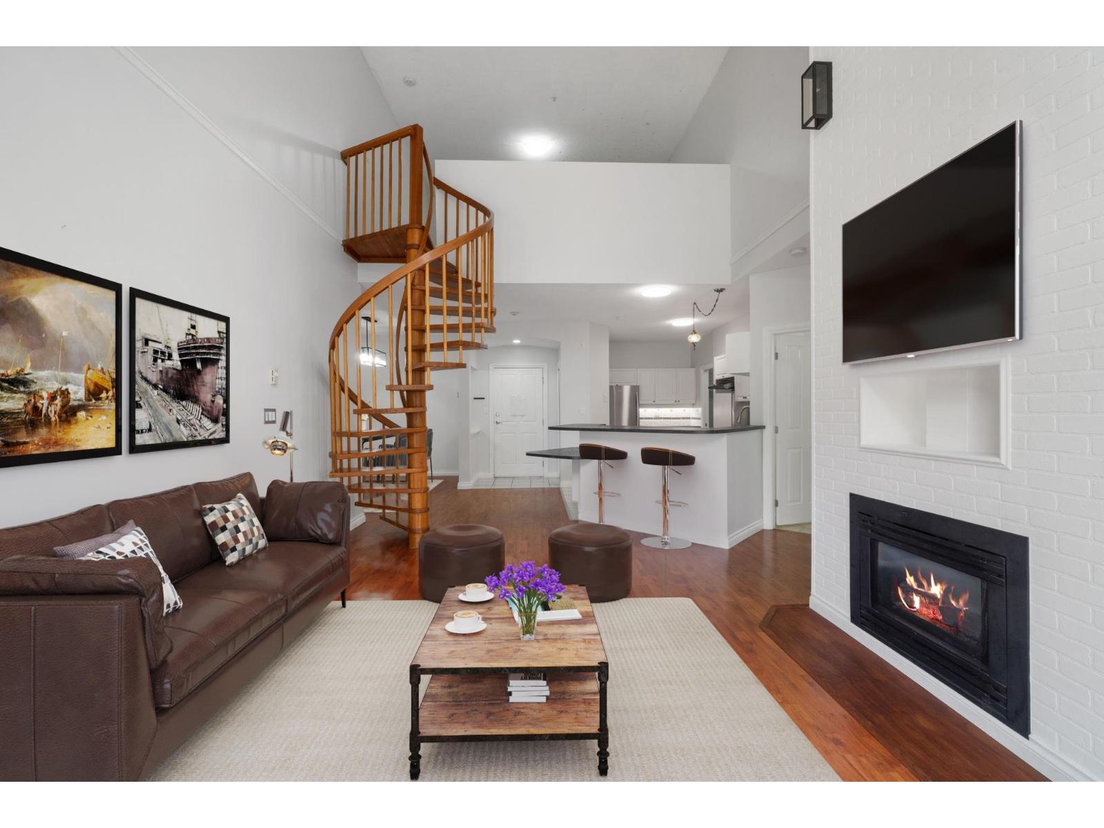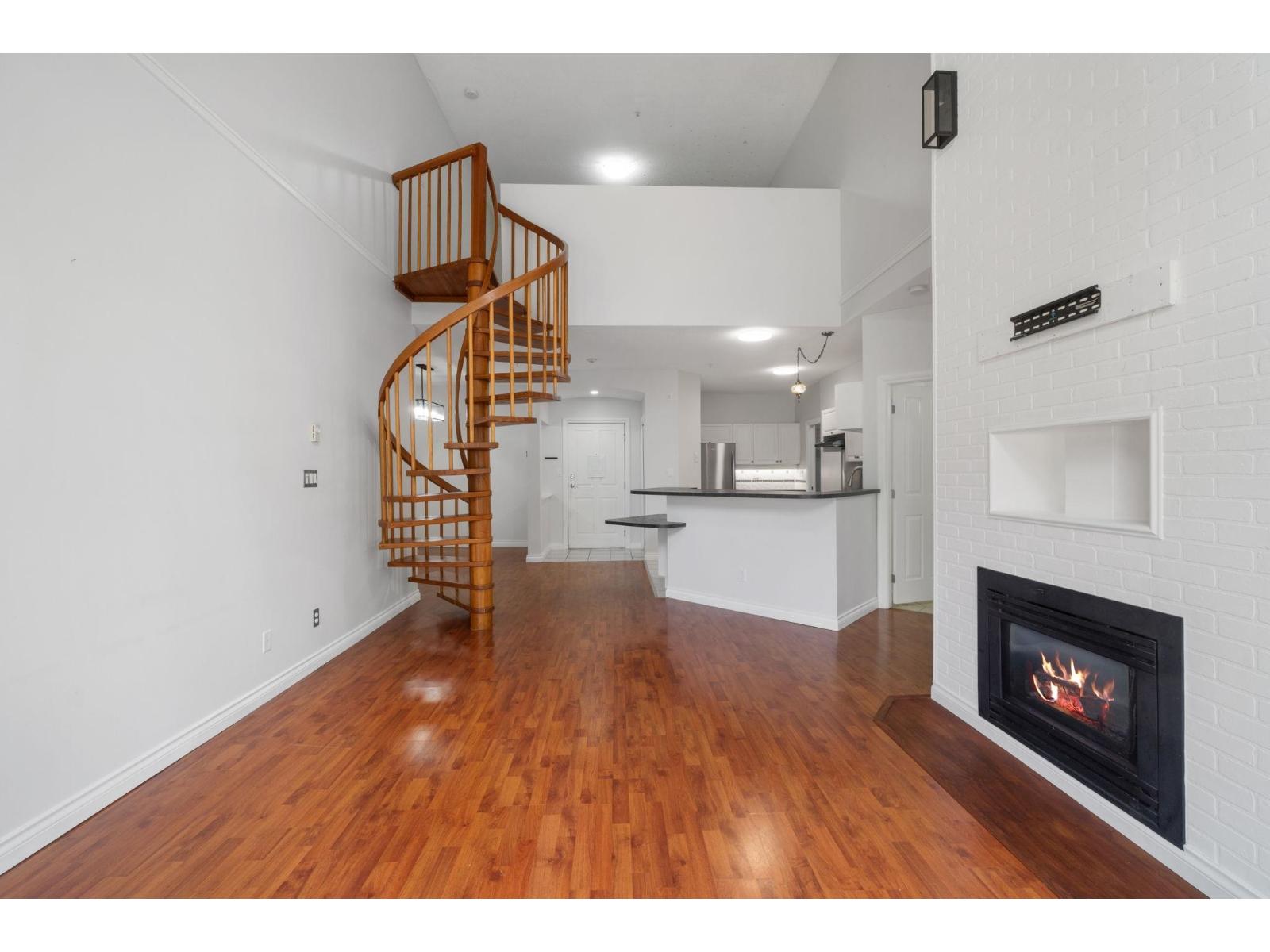 Welcome to Yale Terrace! This updated top-floor 2-bed, 2-bath home offers over 1,357 sq ft of modern living space. Soaring 17' vaulted ceilings and a stunning spiral staircase lead to a versatile loft, ideal for an office or cozy retreat. Recent updates include fresh paint, modern lighting, updated vanities, and newer kitchen appliances. The open-concept layout is perfect for entertaining, with easy flow from kitchen to dining to living area. Enjoy 2 side-by-side parking stalls, a storage locker, and included gas/hot water in your strata fees. Conveniently located near shopping, schools, transit, and Hwy 1. A new roof was installed in 2019 (fully paid). Don't miss this unique opportunity! Select photos include virtual staging to showcase the property's potential layout and design. (id:63510)