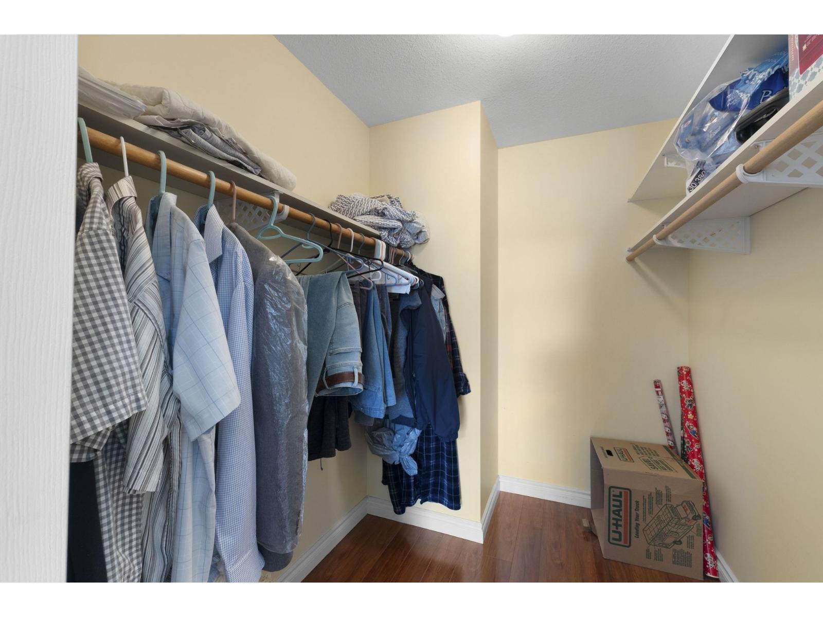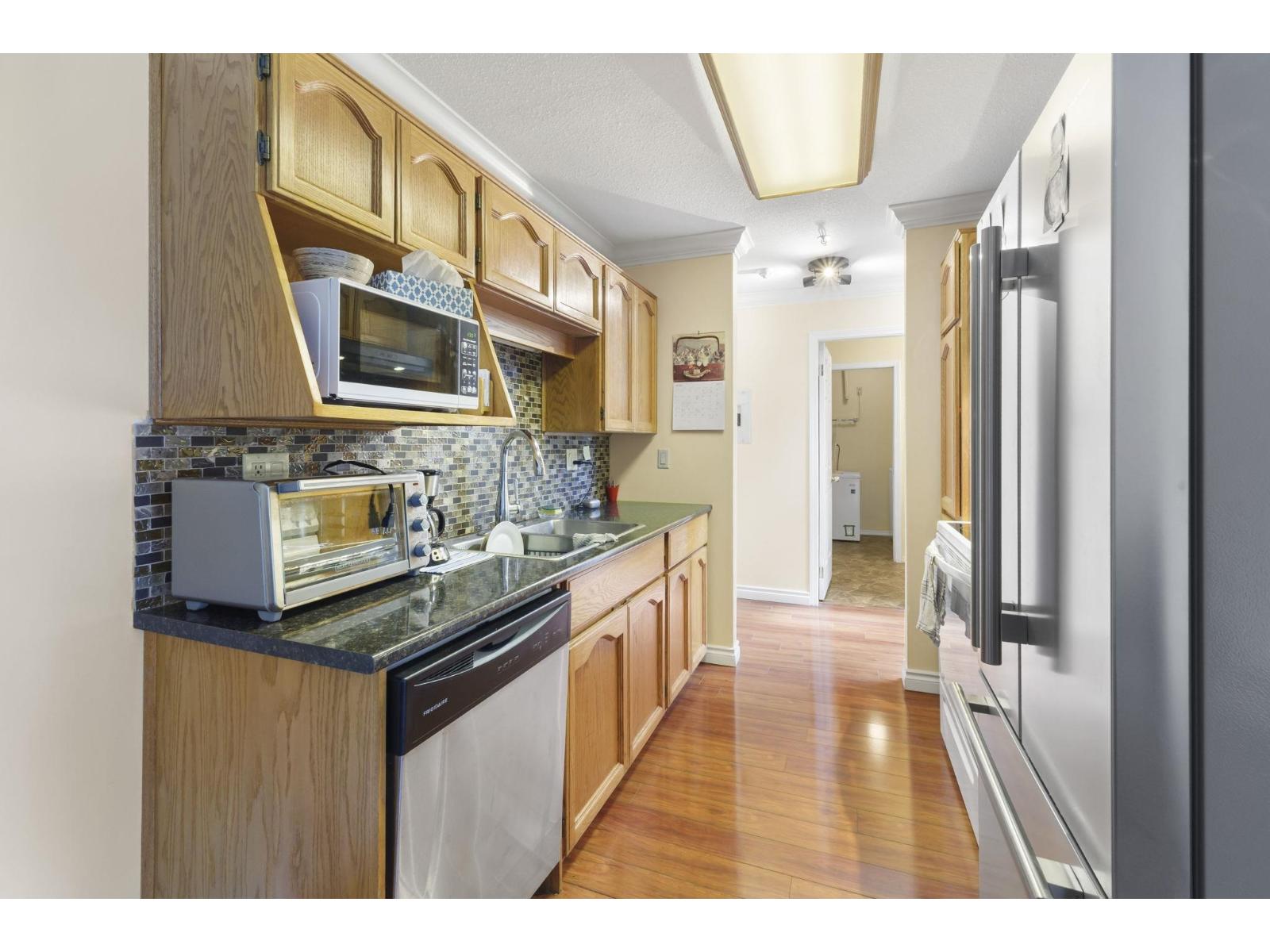 Top-floor charm in Central Heights Manor! This bright 2 bed, 2 bath condo welcomes you with a skylit foyer and stylish laminate floors throughout. Enjoy formal living and dining spaces with elegant crown moulding, rich draperies, and a cozy wall-mounted electric fireplace. Step into the sunny south-facing deck through sliding glass doors. The galley kitchen features sleek stainless steel appliances. Relax in the spacious primary bedroom with vaulted ceilings, walk-in closet, and 4-piece ensuite. The second bedroom is ideal as a guest room, office, or den. In-suite laundry with extra storage, 2 storage lockers, and a secure underground parking stall, and great amenities that include a gym, games room, workshop, art room, coffee area, guest suites, BBQ pit, and a community piano! (id:63510)