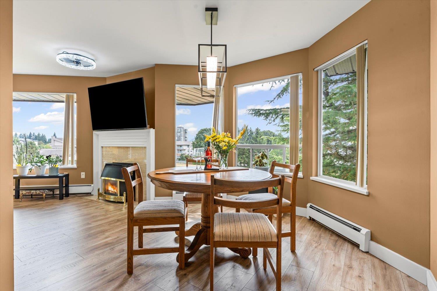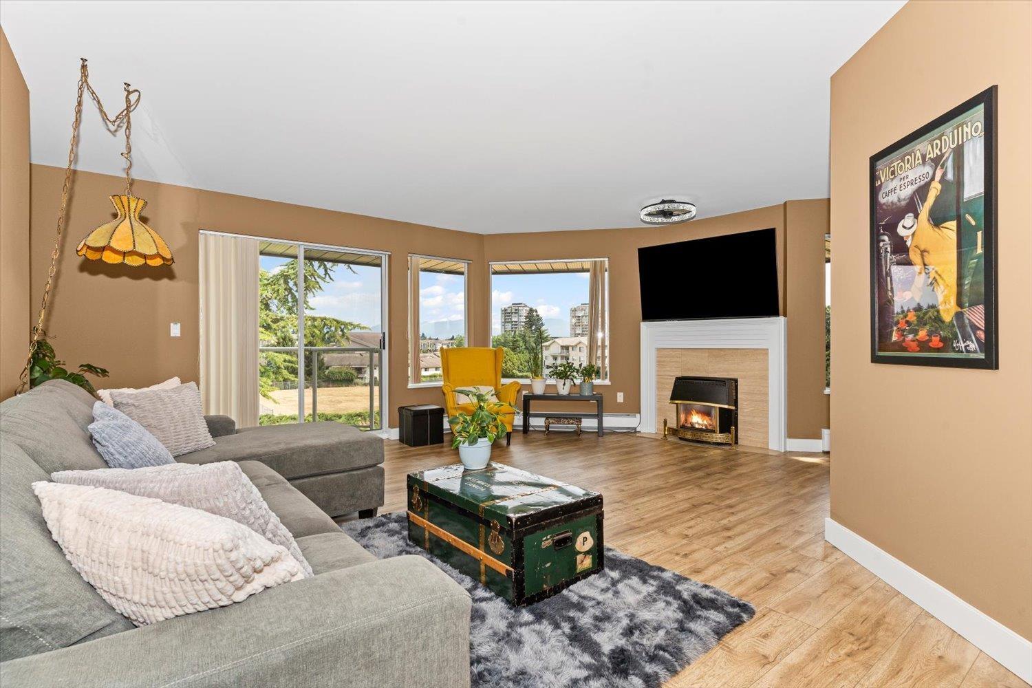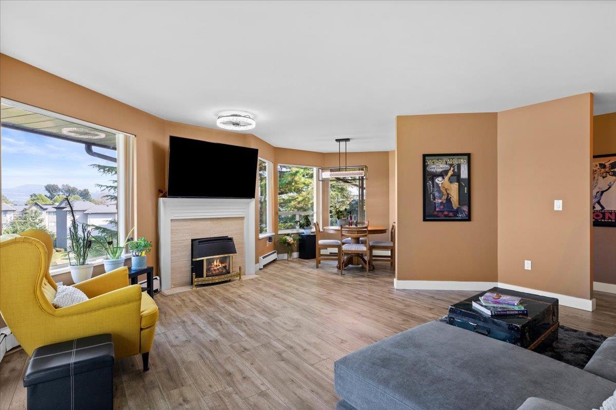PENTHOUSE!! No Age Restrictions! Super rare top floor, corner unit with 12 windows, gas fireplace, large balcony, privacy and stunning open fields behind! Located right in the heart of Abbotsford in a very small, premium GATED community, this well maintained unit and complex is soaked in natural light from walls of windows, boasting generous bedrooms, updated bathrooms, and an inviting, open feel. Pride of ownership shines through every detail. 2 bedrooms, 2 full baths, insuite laundry, and over 1,200 square feet of space! Underground parking adds peace of mind. Move-in ready and waiting for you - this is the one you've been dreaming of! (id:63510)
