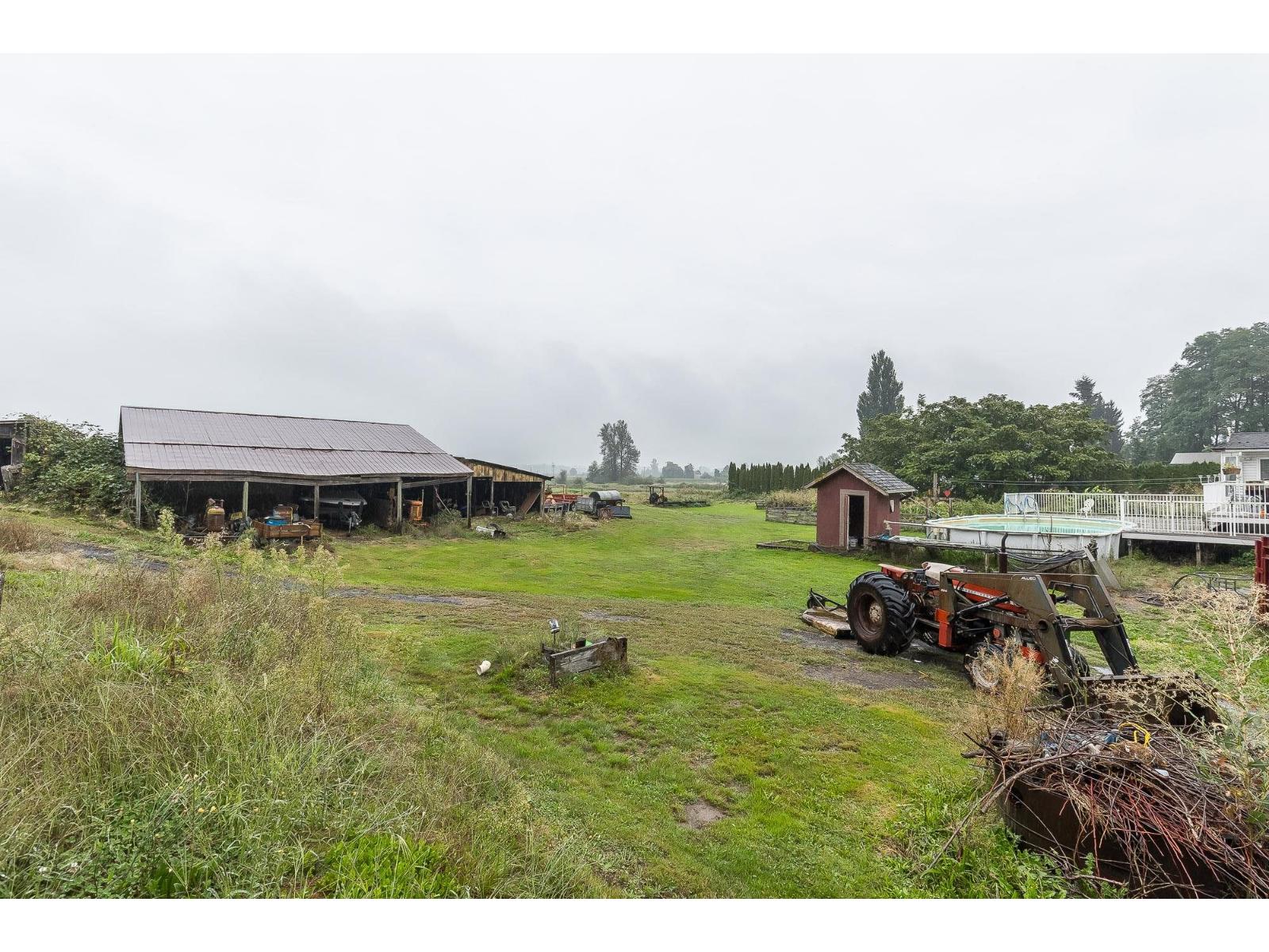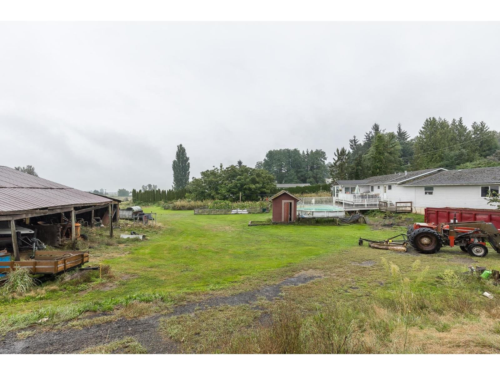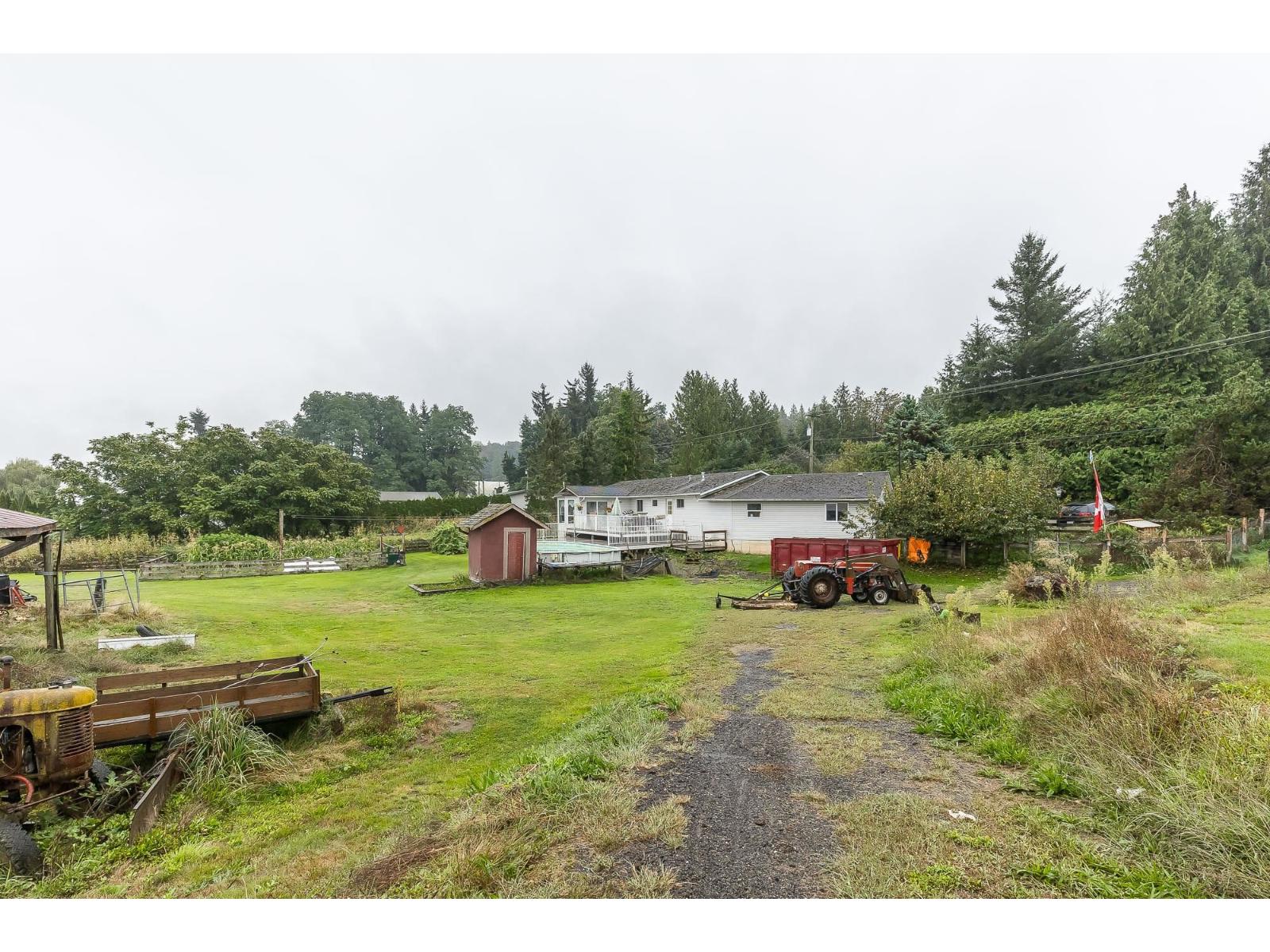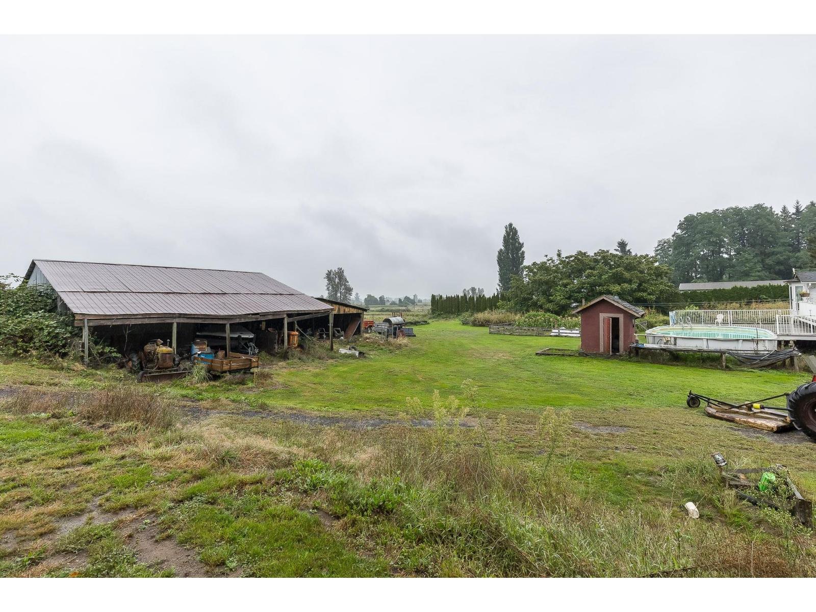 Welcome to one of Abbotsford's rarest offerings - 7.65 acres on prestigious Olund Road, a location that perfectly blends country serenity with city convenience. This expansive property sits on the very edge of town, just minutes from MEI schools, Rick Hansen Secondary, Highstreet Mall, Bolt Fitness Centre, ice rinks, and endless parks. The residence is a 2,450 sq. ft. rancher with generous living spaces, a large country kitchen, and ample room for family living. The property includes a high-ceiling 32x40 machine shed with 220 power, perfect for equipment, vehicles, or workshop use. Outdoor living is a dream here with an above-ground pool, sprawling lawns, and breathtaking North Shore Mountain views. Whether you're looking for a working hobby farm, future estate build site, or investment. (id:63510)