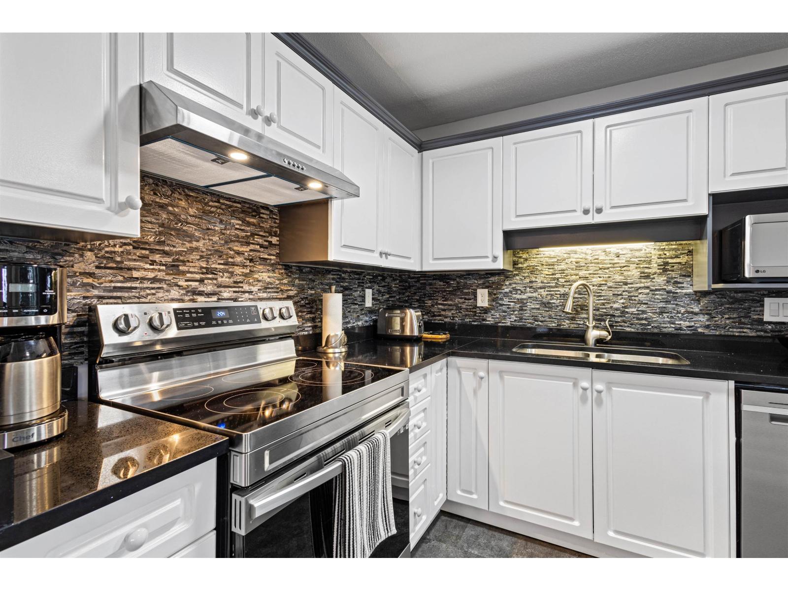 Welcome to this stunning 2-bedroom, 2-bath CORNER -UNIT offering over 1,000+ SQFT of modern luxury. Step into an open, airy space highlighted by 9 foot ceilings and an abundance of NATURAL LIGHT. Recently RENOVATED, this home features a sleek, contemporary kitchen with QUARTZ countertops, BRAND-NEW appliances. Both bedrooms and bathrooms have been meticulously upgraded with high-end finishes with CROWN MOULDING, ensuring comfort and style in every detail. Heating with Natural Gas is INCLUDED in strata fees. Located in a prime area next to CITY HALL, PUBLIC LIBRARY, TRANSIT, MRC REC CENTRE, ALL 3 LEVELS OF SCHOOLS. You'll enjoy convenience, charm, and a vibrant community at your doorstep. (id:63510)