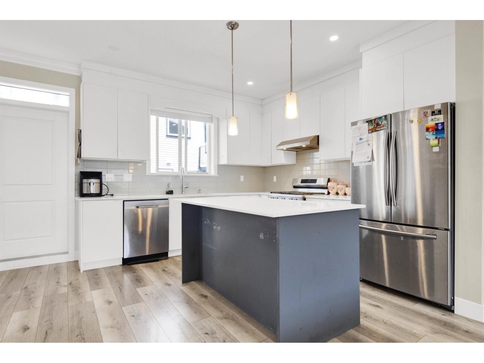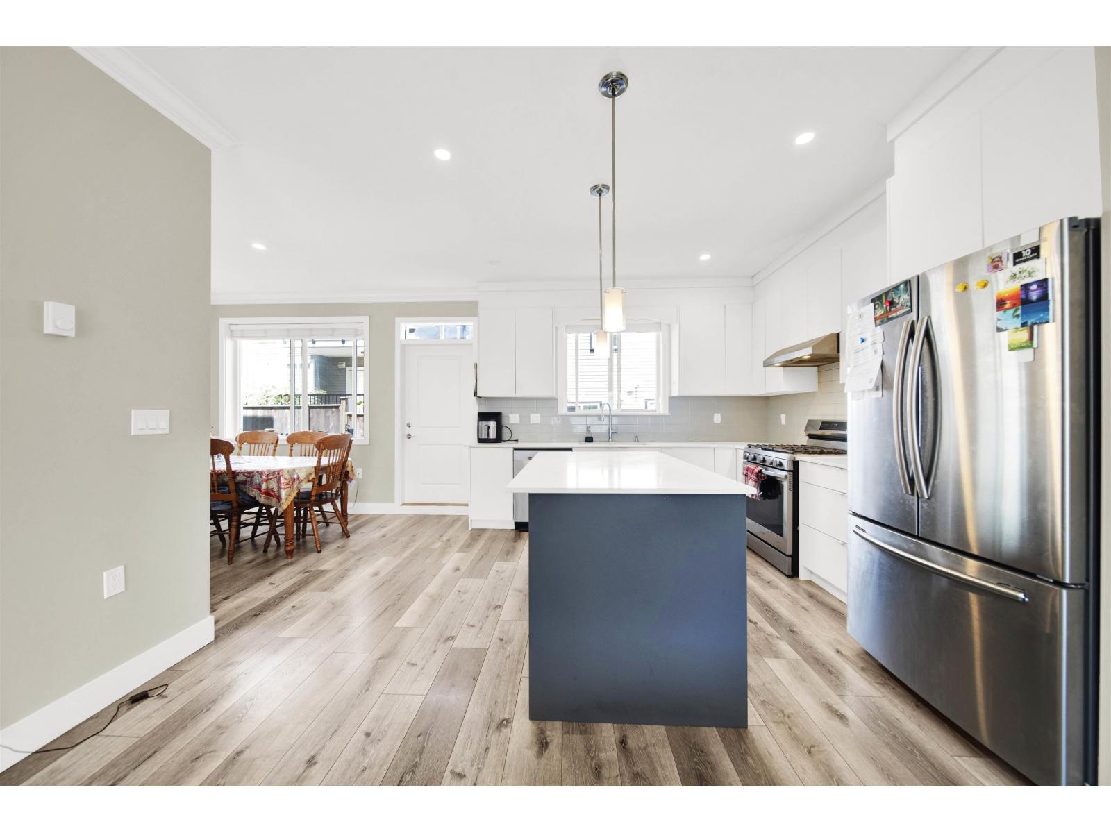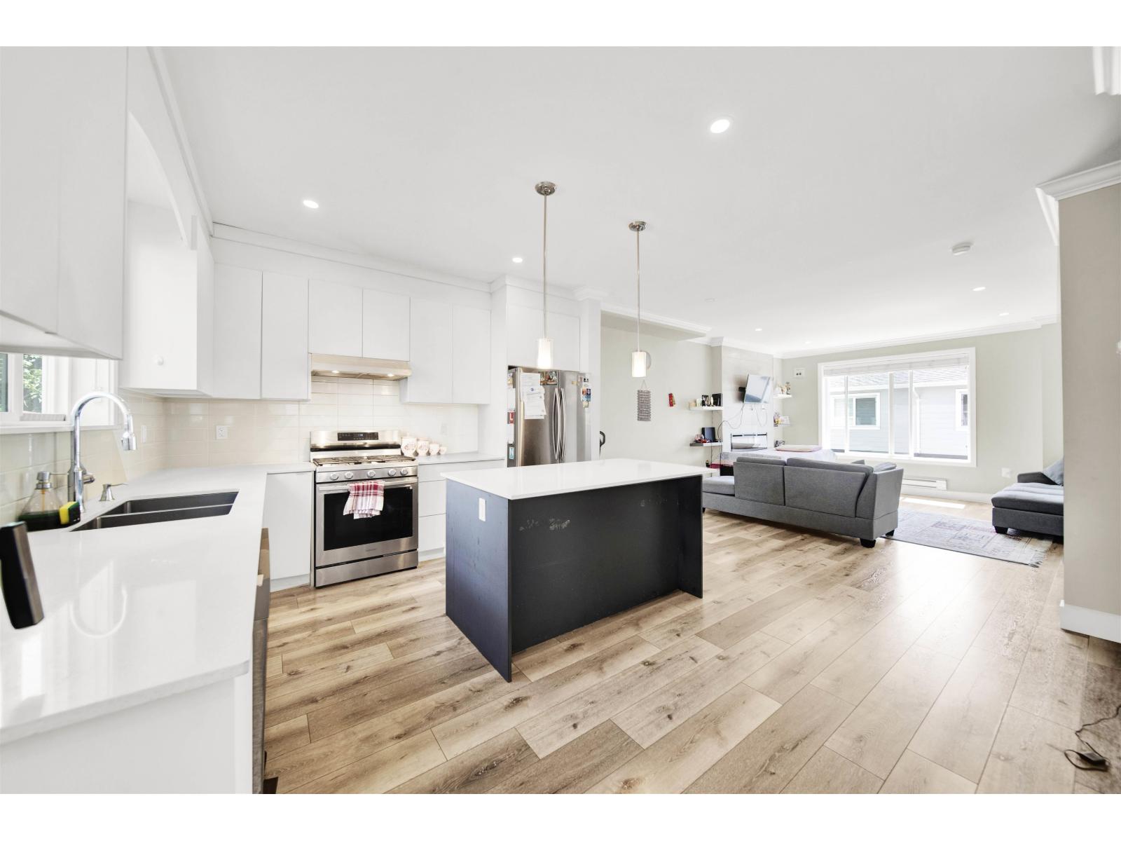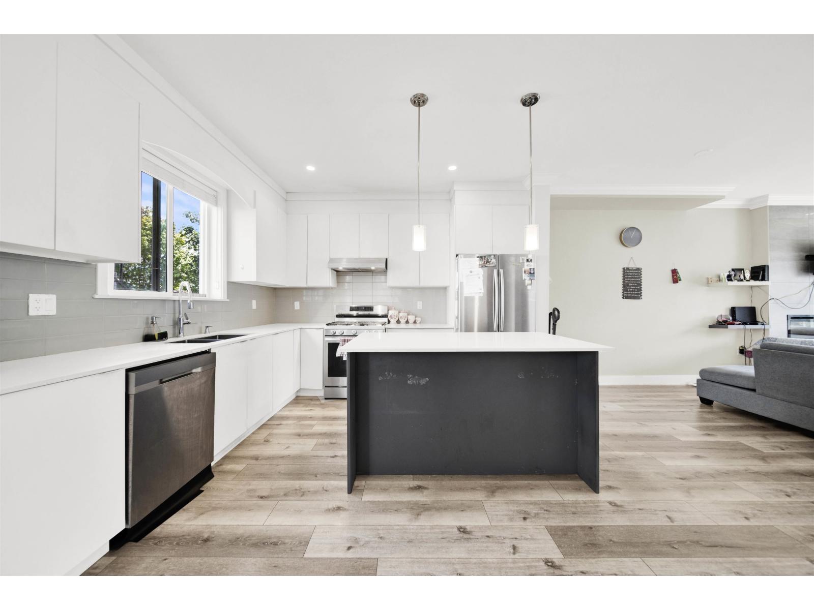 Stunning Corner Unit at Maclure Point! This beautifully designed home features over 1,800 sq. ft. of contemporary West Coast living, complete with a double car garage and 9' ceilings on the main floor. The modern kitchen boasts sleek flat-panel cabinetry, solid quartz countertops, stainless steel appliances, and is complemented by stylish designer lighting fixtures in both the kitchen and dining areas. Relax by the electric fireplace in the spacious living room. The master bedroom includes a generous walk-in closet for added convenience. Enjoy outdoor space with a fenced yard, and benefit from an unbeatable location-just minutes from schools, freeway access, walking trails, and urban amenities. Rentals and 2 pets allowed-perfect for families or investors! (id:63510)