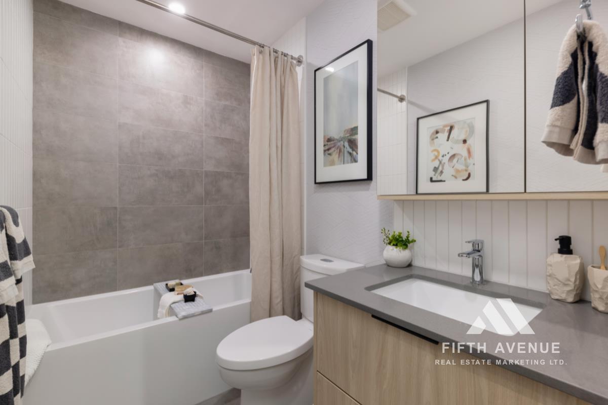 Move in ready at Highstreet Village! Corner Unit. Spacious 798 sq ft, 2 bed + 2-bath condo at Abbotsford's best-selling community. Enjoy 9' ceilings, durable vinyl plank flooring, and sleek roller shades. The stylish kitchen features quartz countertops, two-tone cabinetry, and high-end stainless steel appliances. The spa-like ensuite boasts a frameless glass shower, main bath offers a deep soaker tub. Steps from Highstreet Shopping Centre, top schools, Hwy 1, and Abbotsford Airport. 1 parking and 1 storage space included! (id:63510)