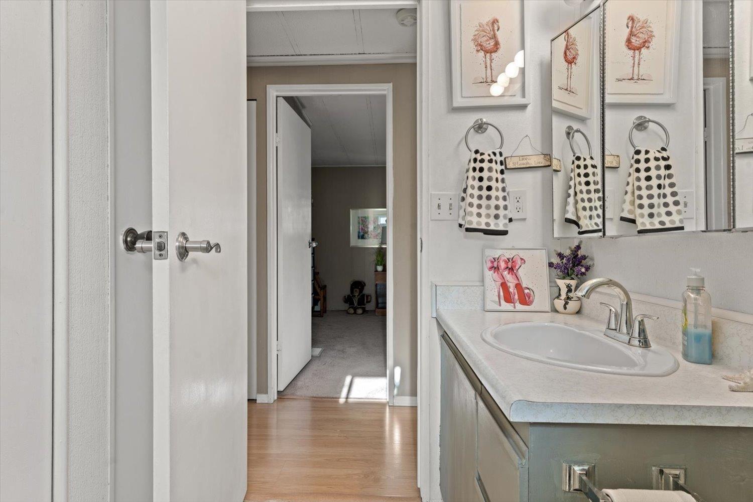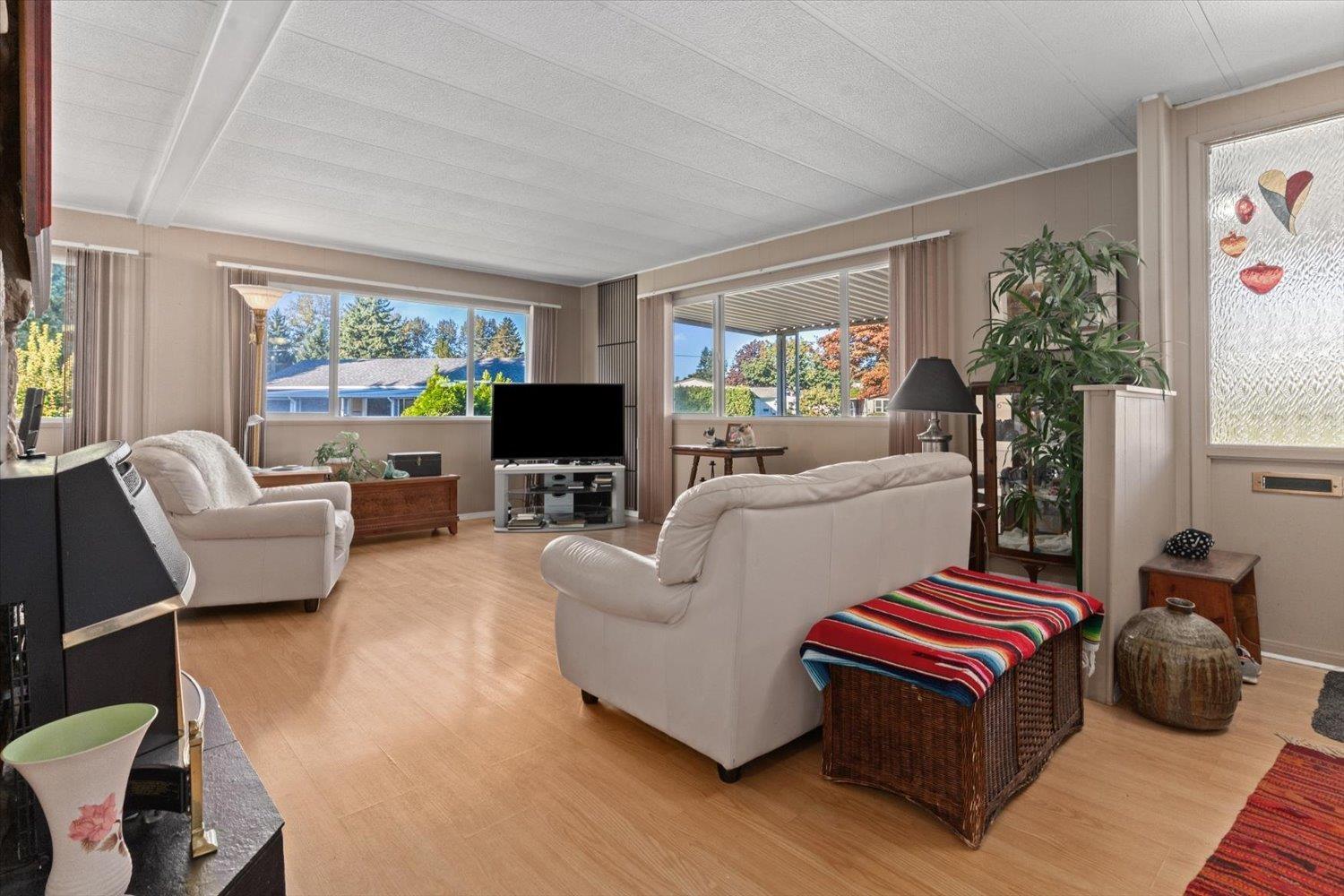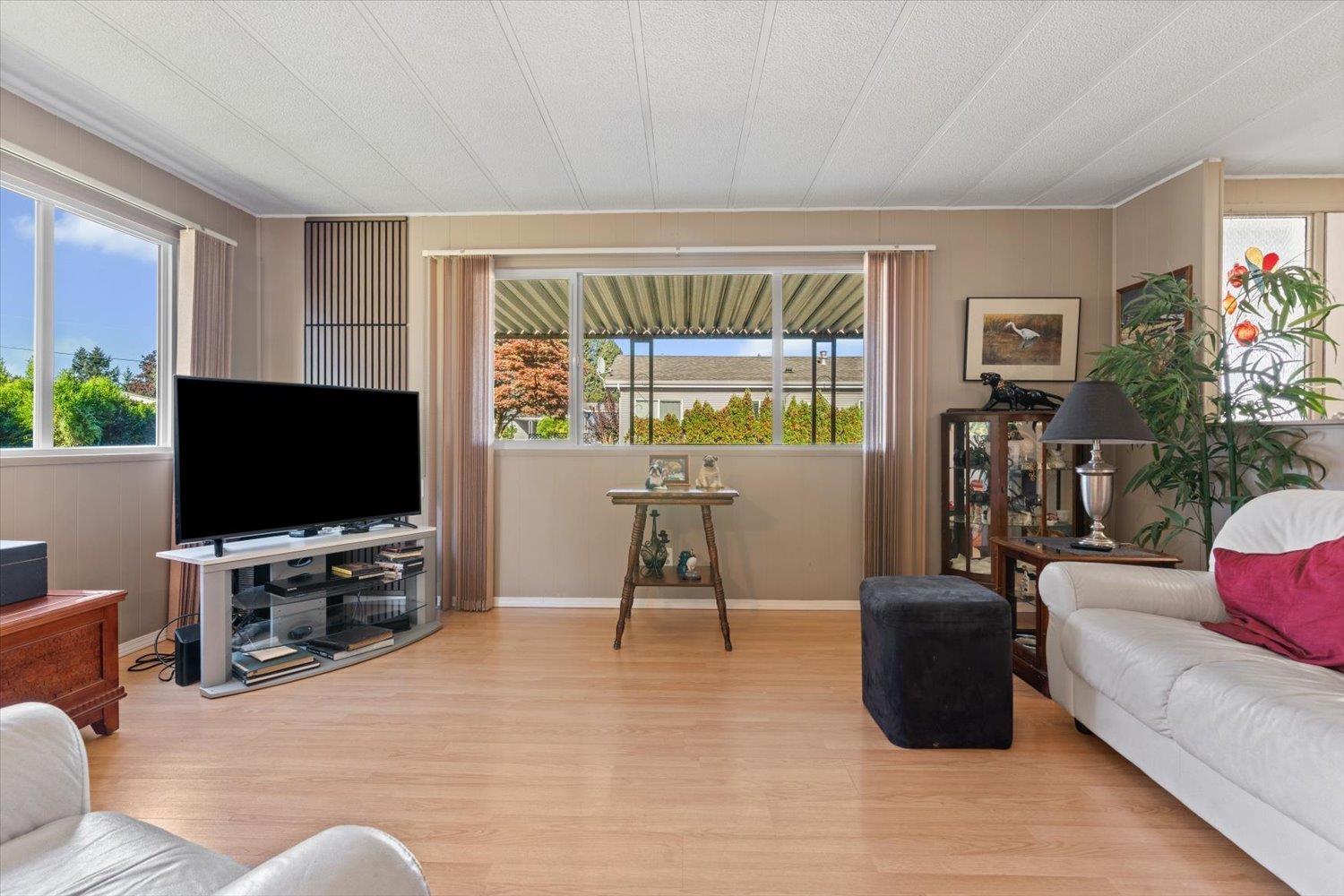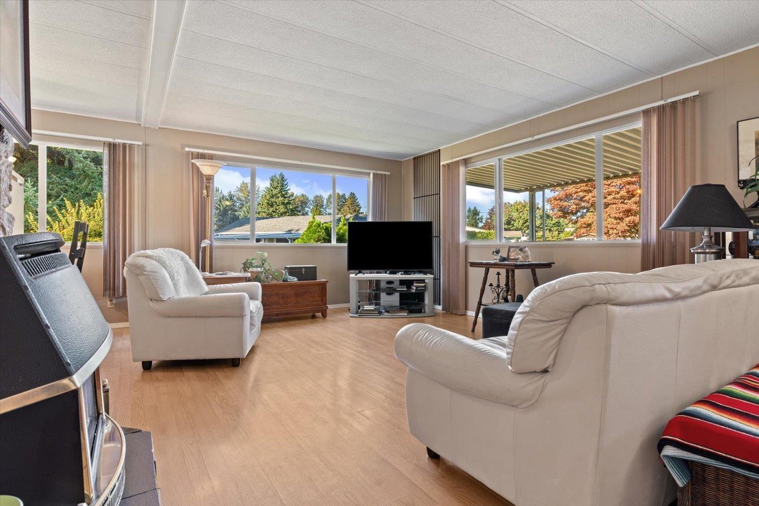 Welcome to Paradise Park! One of Abbotsford's most friendly and secure 55+ communities. This well-cared-for double-wide home offers 2 bedrooms, 2 bathrooms, and a bright, inviting layout filled with natural light and warmth. Enjoy peace of mind with numerous exterior updates and the charm of a cozy, functional floor plan. The enclosed patio opens to a spacious backyard with two storage sheds and room for your garden or outdoor retreat. Manicured grounds, wonderful neighbors, and the bonus of one small pet allowed make this community truly special. Attractively priced for a senior budget, this home is a must-see! (id:63510)