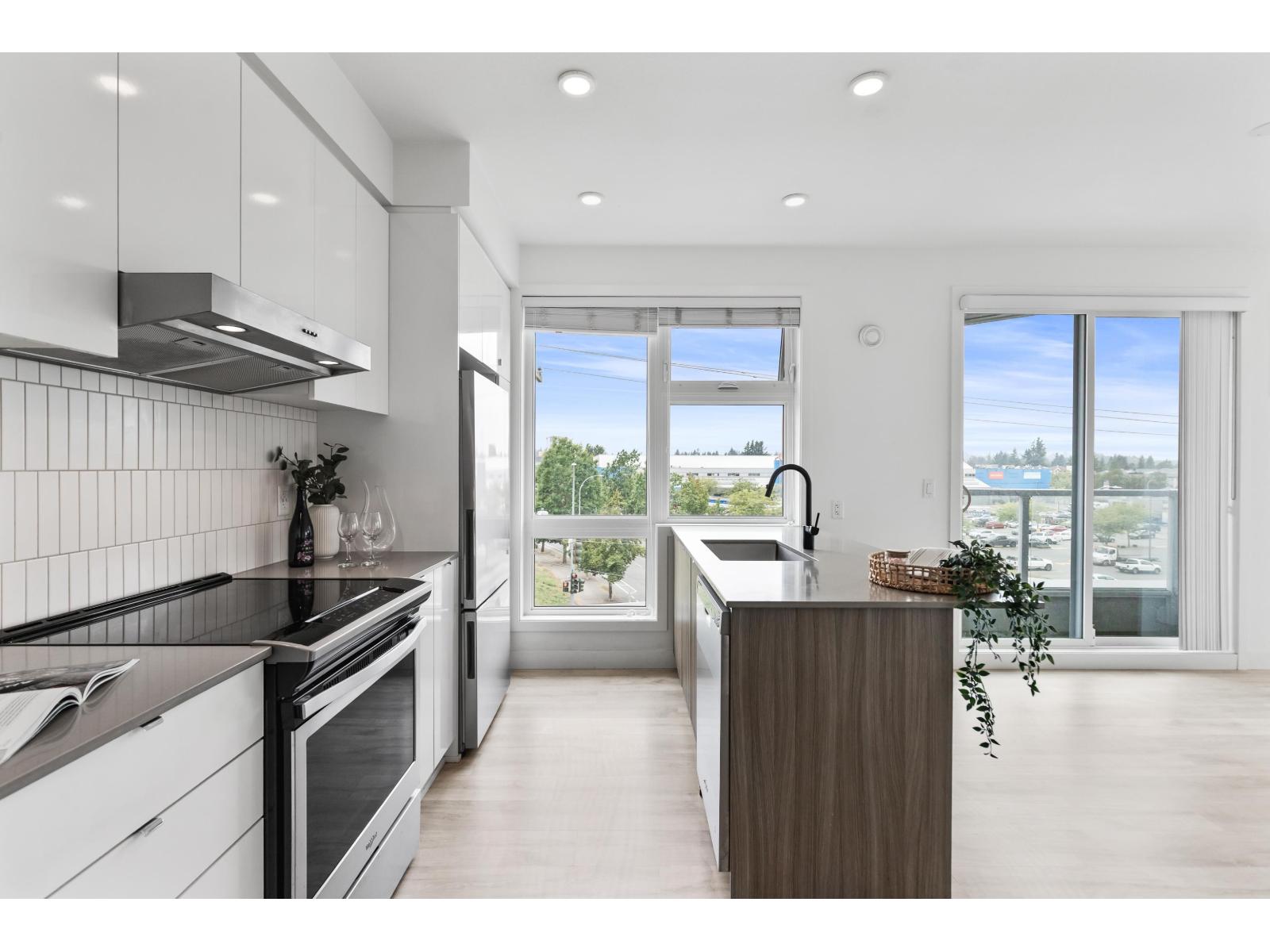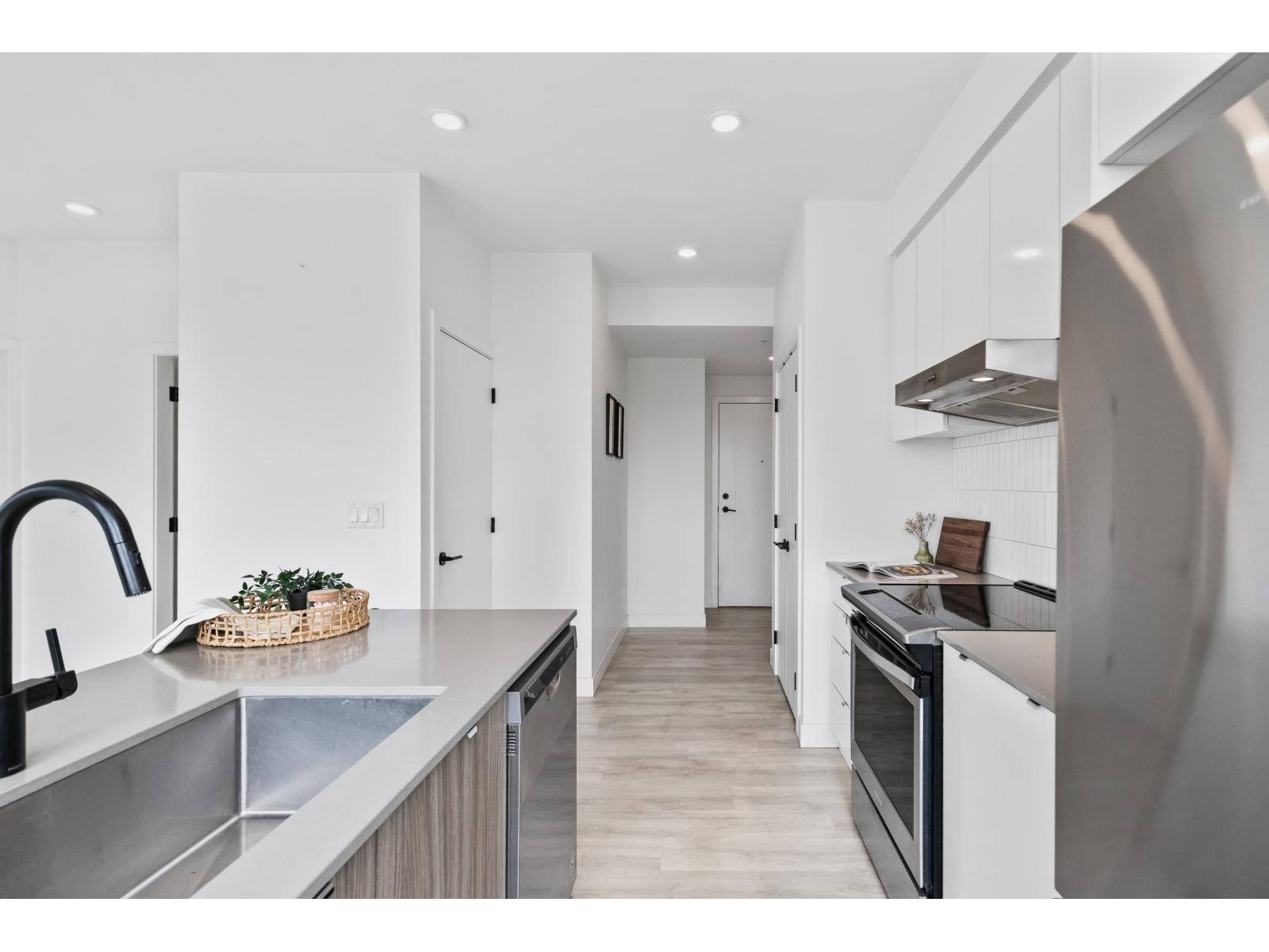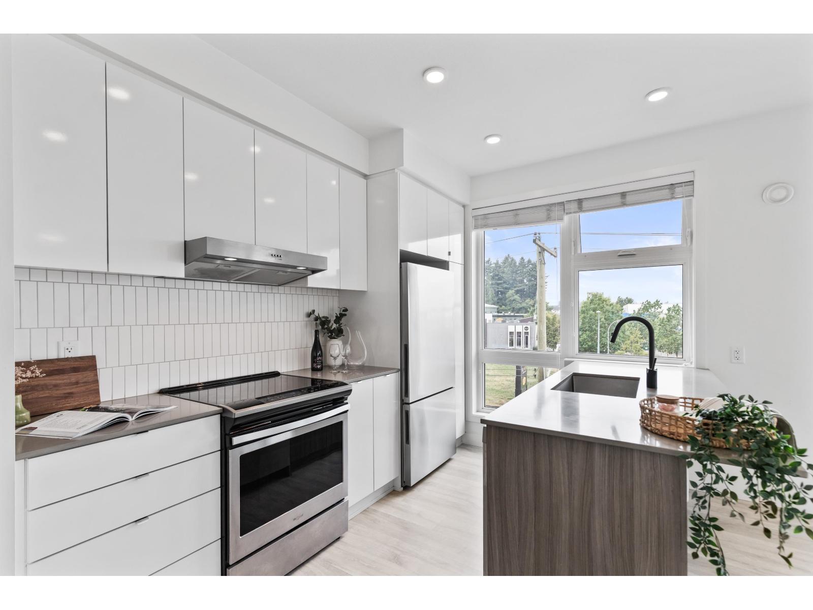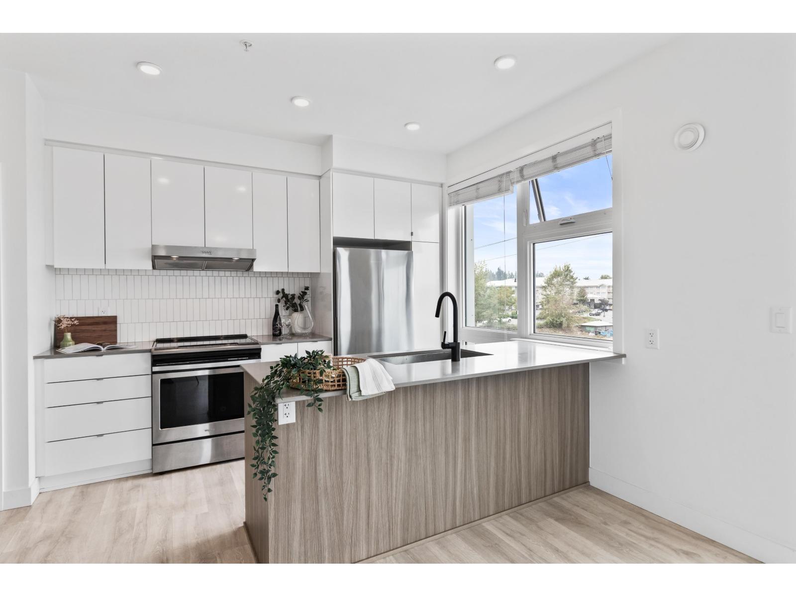 Light-filled and stylish, this Scandinavian-inspired corner condo pairs contemporary design with a prime location. Wide-plank floors and large windows flood the space with natural light, while a Juliette balcony adds fresh air. The kitchen shines with Fisher & Paykel + Whirlpool appliances, quartz counters, and an eating bar. Enjoy in-suite laundry, a versatile pantry/closet, spacious entry, and a quality primary closet organizer. COURT WEST allows 2 pets and offers a massive courtyard with movie nights, shared EV chargers, secure bike room, 1 parking stall, and a large locker-steps to Seven Oaks Mall, Superstore, Trading Post Brewing, Cora's, transit, and minutes to Mill Lake Park. QUICK COMPLETION POSSIBLE (id:63510)