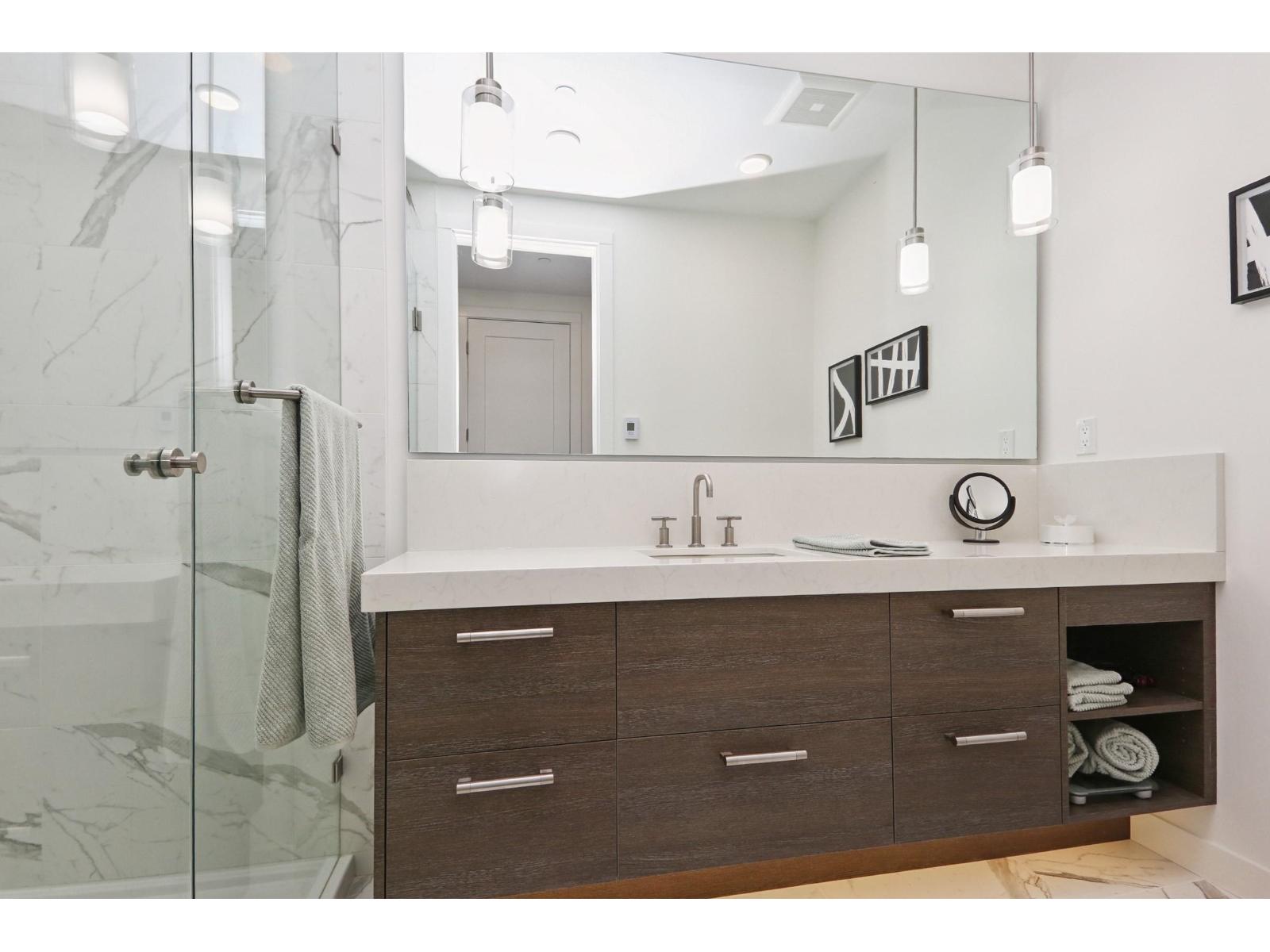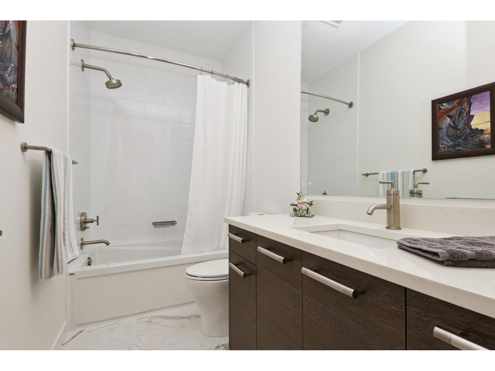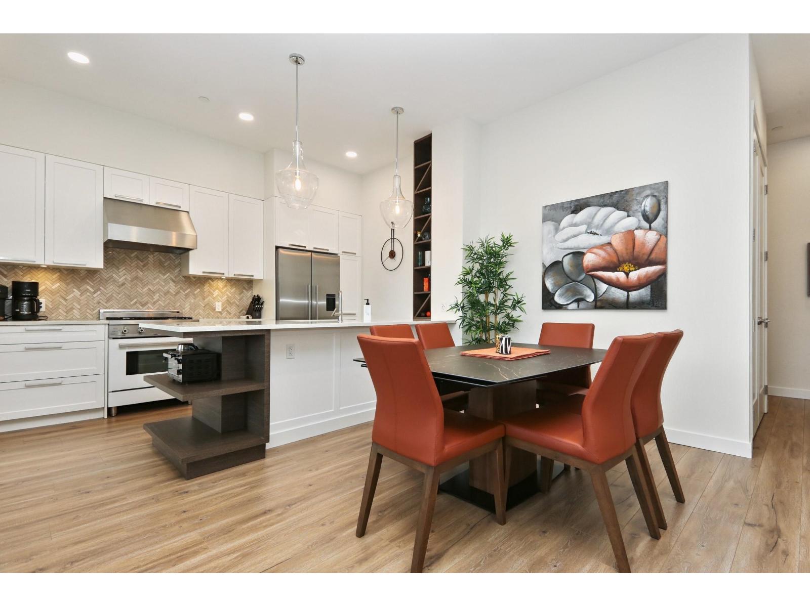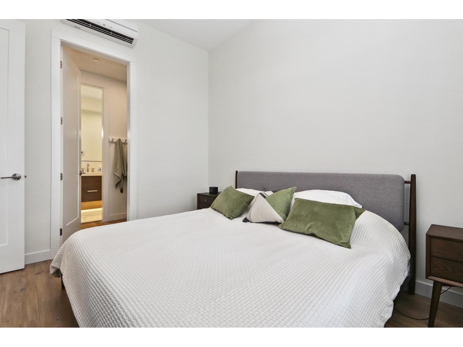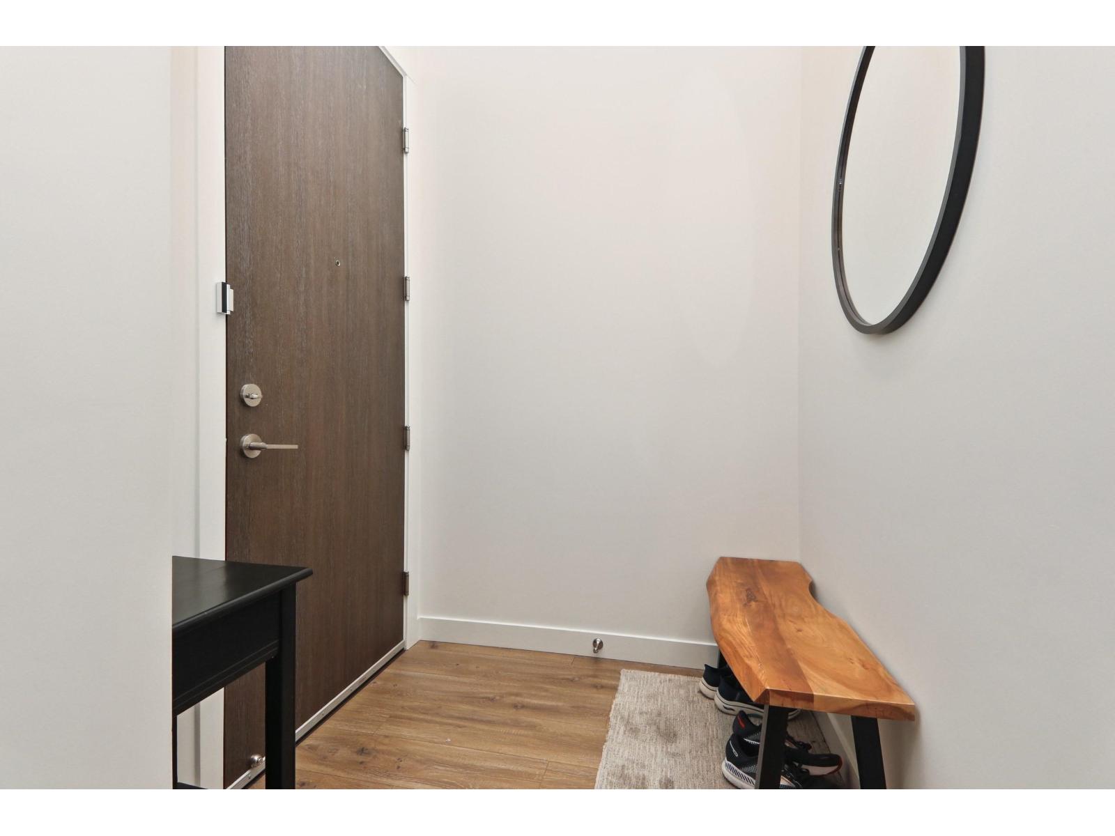 Luxury Top-Floor Corner Unit! Step into this exceptional 2-bedroom, 2-bathroom penthouse and feel instantly at home. With 1122 sq ft, of living space 10 ft ceilings and air conditioning, this bright, beautiful condo is the perfect blend of comfort and sophistication. Livingroom offers a custom built-in TV cabinet with storage and gas fireplace. The gourmet kitchen is equipped with high end stainless appliances, built-in wine rack, and quartz countertops. Primary ensuite features an oversized shower and both bathrooms have heated flooring. Updates include waterproof laminate plank flooring and freshly painted walls & ceilings(2023) Covered NW-facing deck with natural gas hookup & water bib. Large secure storage unit with metal roll down door at the end of one of your 2 parking spots. (id:63510)